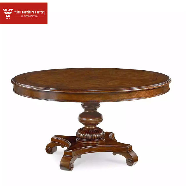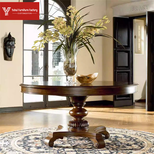 Tavolo rotondo in legno massello stile americano con decorazioni intagliate, tavolo da pranzo e sedie in stile barocco retrò, personalizzabile.