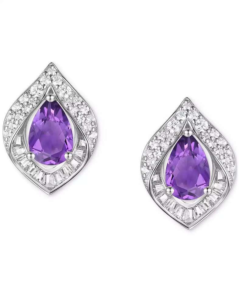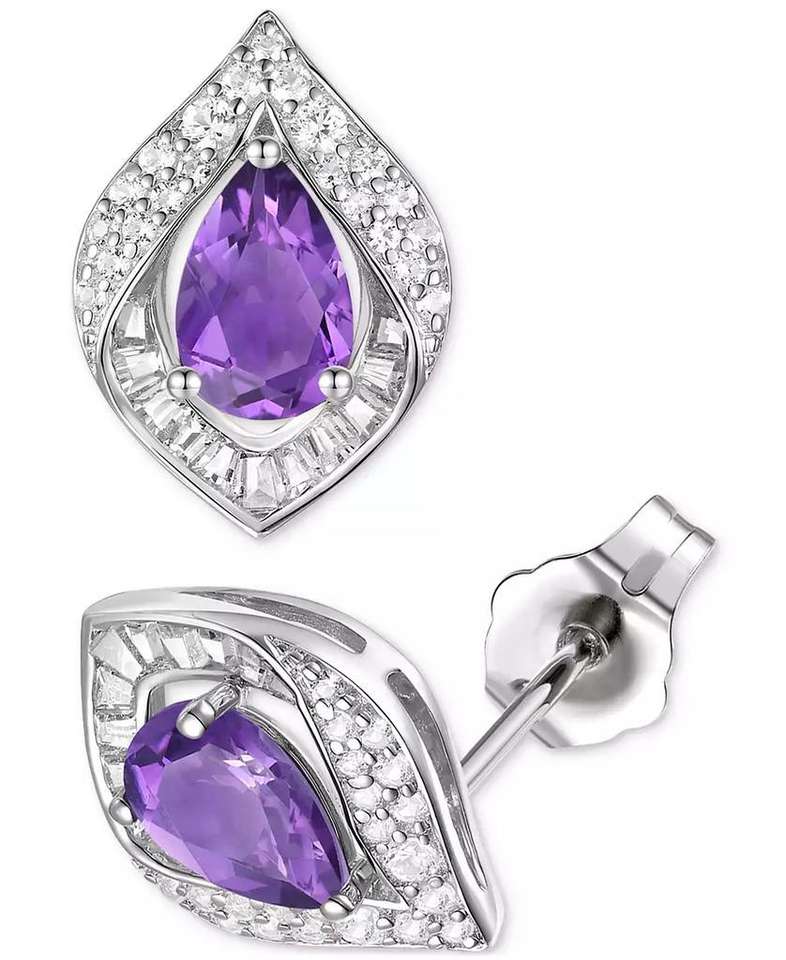 Ametista (1-7/8 ct. T. w.) & Zaffiro bianco coltivato in laboratorio (1/5 ct. T. w.) Orecchini a bottone pera Halo in argento Sterling (anche in aggiunta