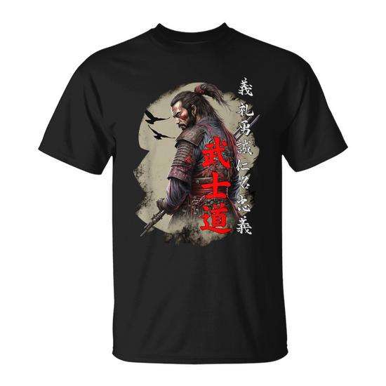 Maglietta da uomo con stampa di un antico guerriero samurai giapponese Bushido, nera, taglia grande