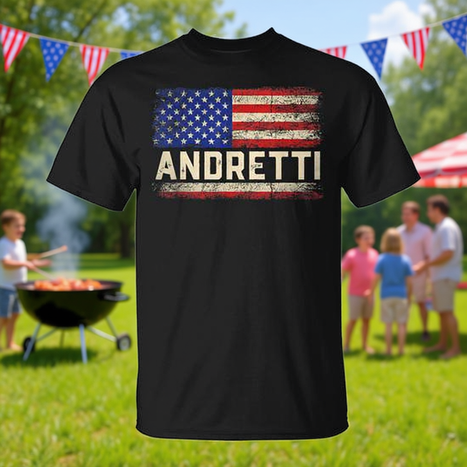 T-Shirt con Nome Andretti e Bandiera Americana, Abbigliamento Promozionale per Riconoscimento del Nome