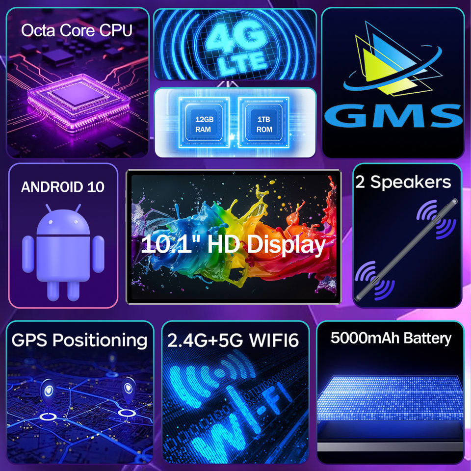 Tablet PC Android 13 da 10.1 Pollici, Octa Core, 12GB RAM, 1TB ROM, Dual SIM, Chiamate 4G, Schermo Touch, MTK, Tablet Educativo per Bambini e Studio