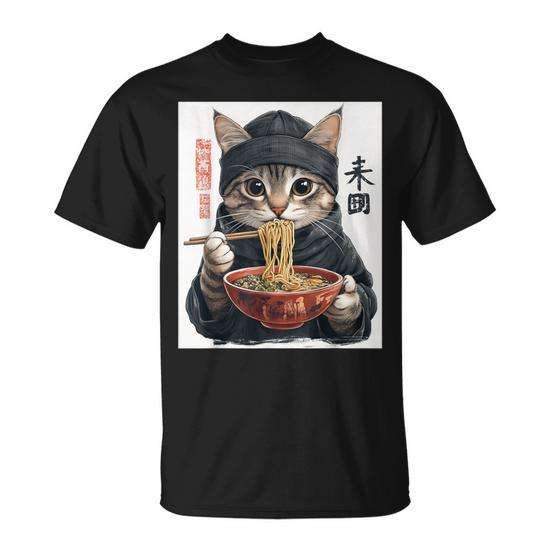 T-Shirt Unisex con Stampa Digitale Anime Gatto e Ramen Stile Giapponese, Collo Tondo, Manica Corta, per Uso Promozionale