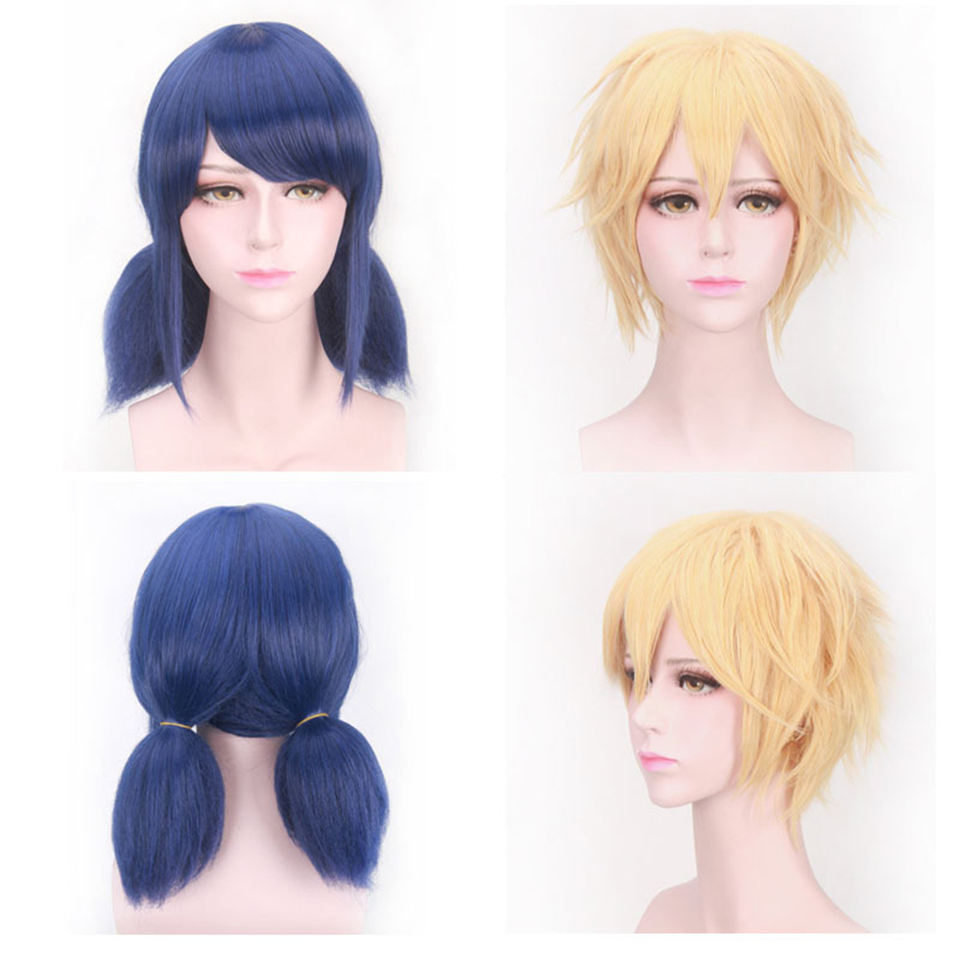 Anime Ladybug Cosplay Wig for Girls Women Blue Hair With Red Rope Stage Performance Black Cat Dress up Wigs