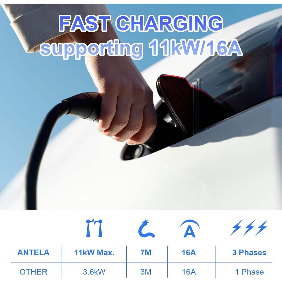 Cavo di ricarica EV Antela Tipo 2 11kW 16A 7M Trifase per Auto Elettriche con Custodia per il Trasporto