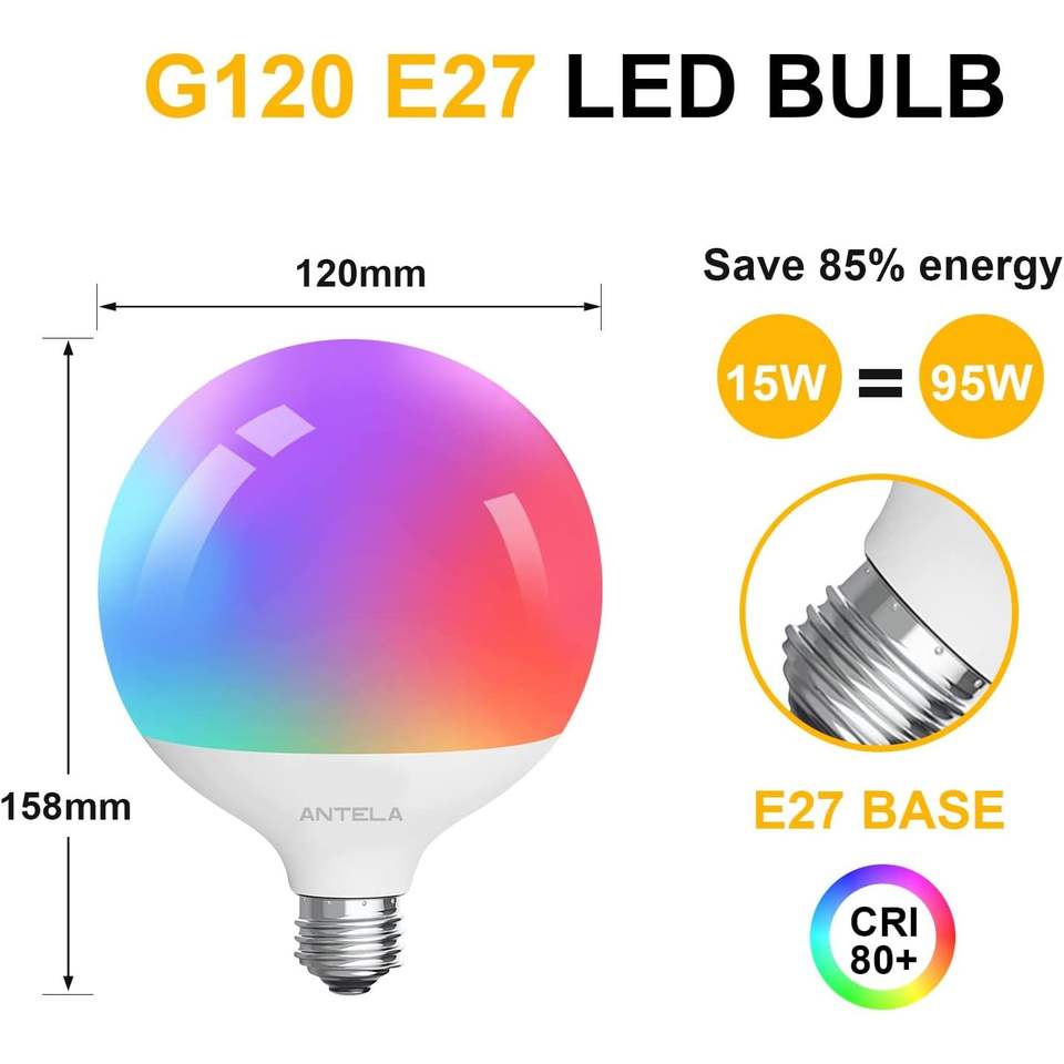Lampadina Intelligente Antela E27 15W LED RGB Dimmerabile, Controllo WiFi tramite App, Luce da Soffitto Compatibile con Alexa e Google Assistant