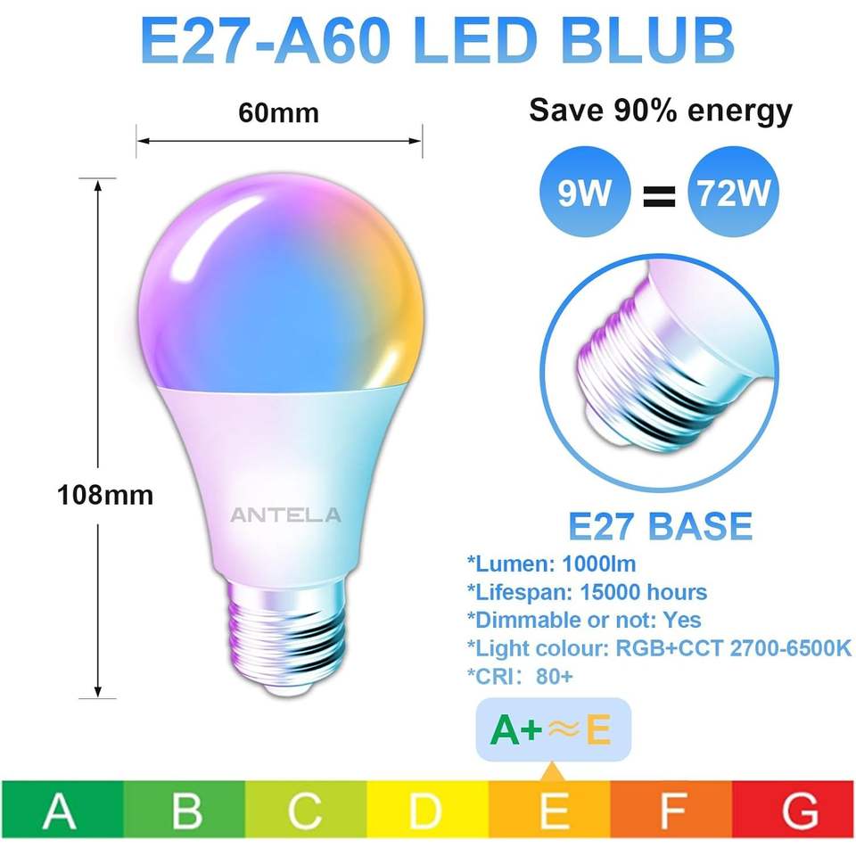 Lampadina LED Intelligente Antela E27 9W 1000Lm AC Wi-Fi, Cambio Colore, Dimmerabile 2700-6500K, 25000 Ore per Illuminazione Domestica