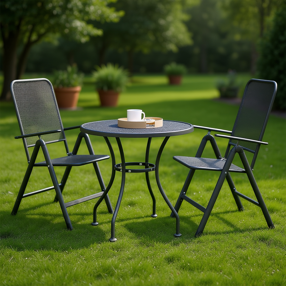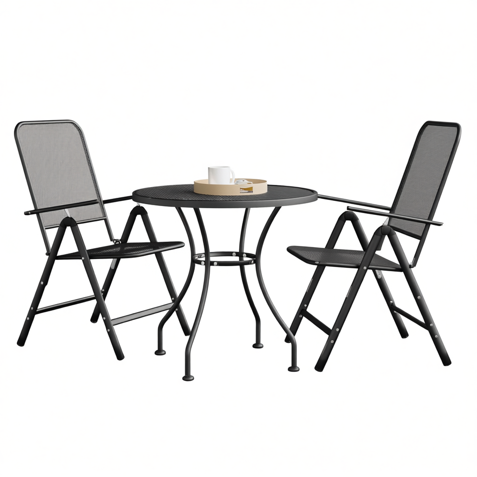 Set da Giardino Antracite con Tavolo Rotondo da 31,5 Pollici e 2 Sedie in Rete Metallica Pieghevole, Arredamento da Esterno dal Design Contemporaneo