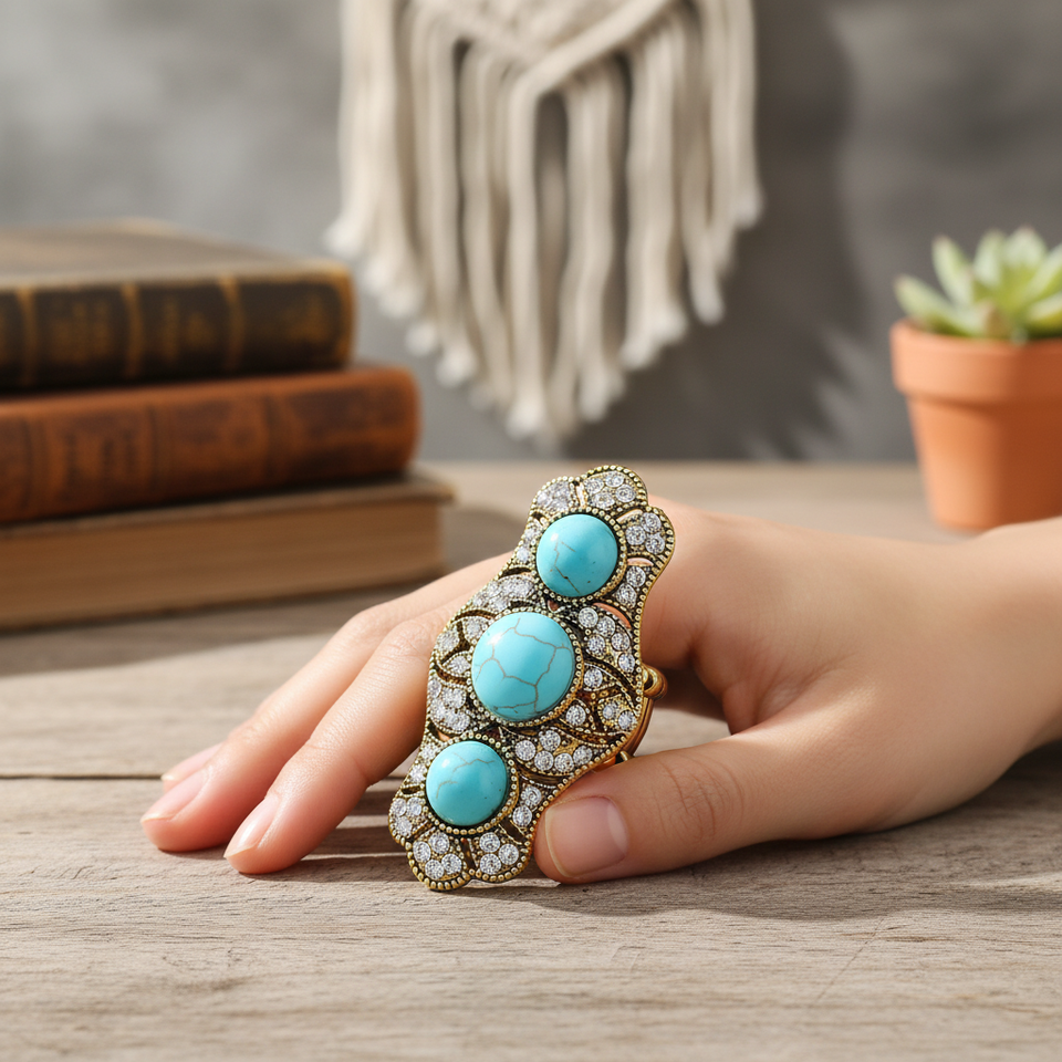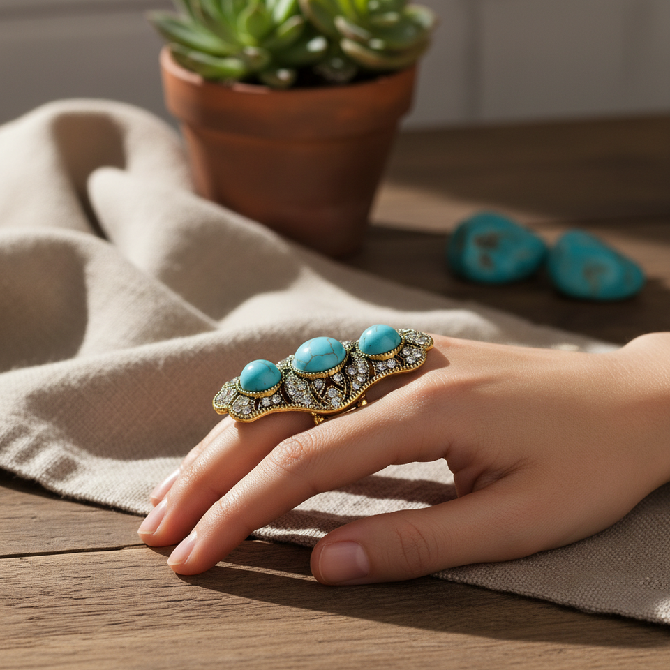 Anti Gold Plated Fashionable Stainless Steel Rings Turquoise Stone Inlay Princess Cut Trendy 18K Grs Certified Fashion Rings