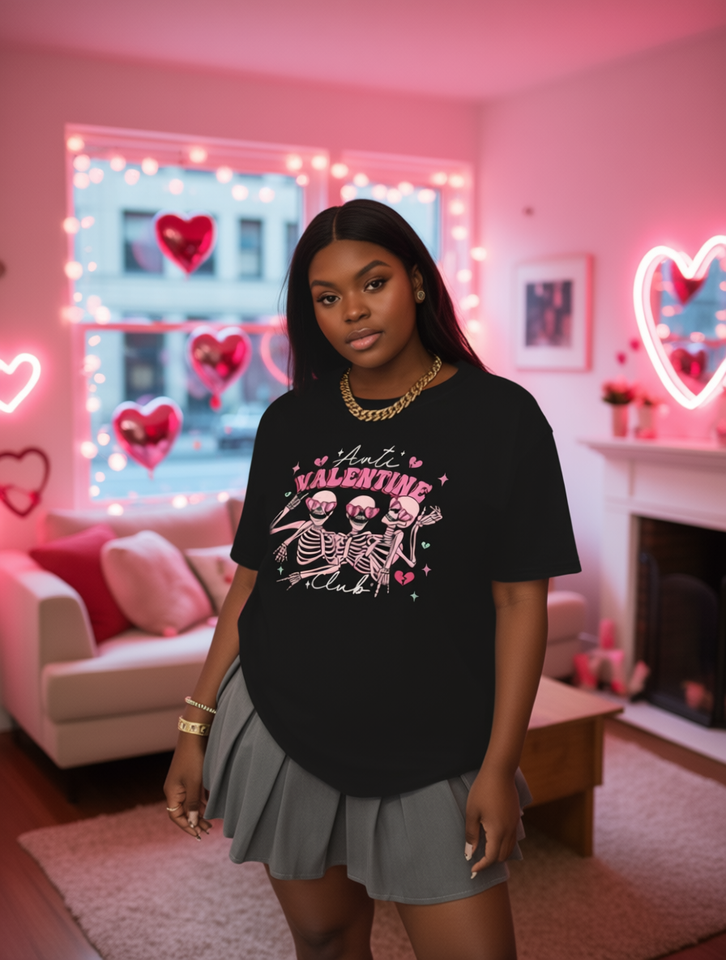 Anti Valentine Club Skull Print T-Shirt Women Plus Size Short Sleeve Round Neck Casual Loose Fit 100% Cotton Spring Summer