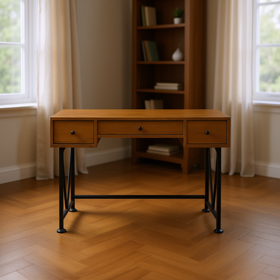 Scrivania Antica a 3 Cassetti con Piano in Legno e Gambe in Metallo Nero per Ufficio e Casa