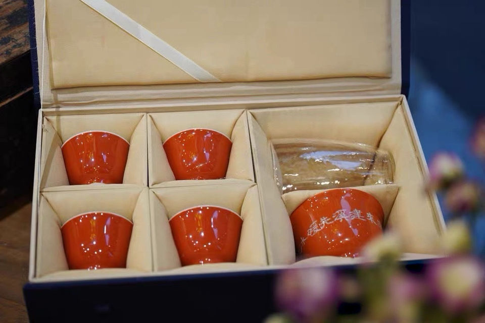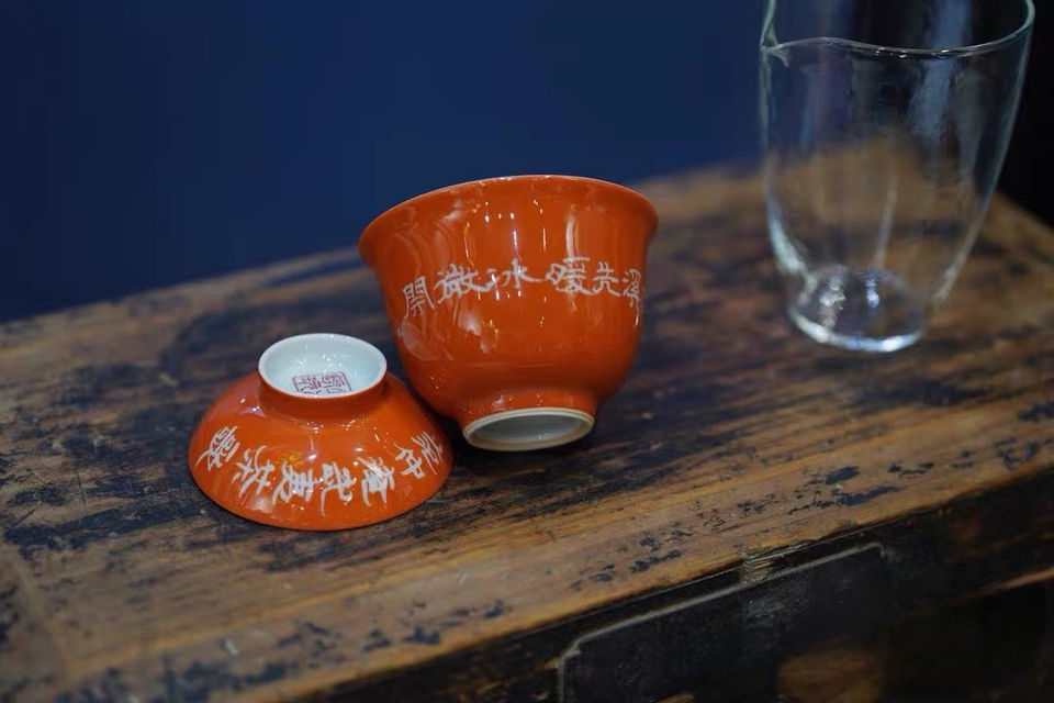 Set da Tè in Porcellana Rosso Corallo Ispirato all'Antico - Gaiwan e Tazze Abbinate Intagliate a Mano con Poesia, Resistenti al Calore e Adatte agli Alimenti (Ecologico)