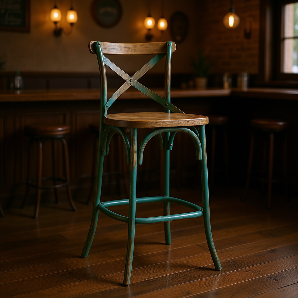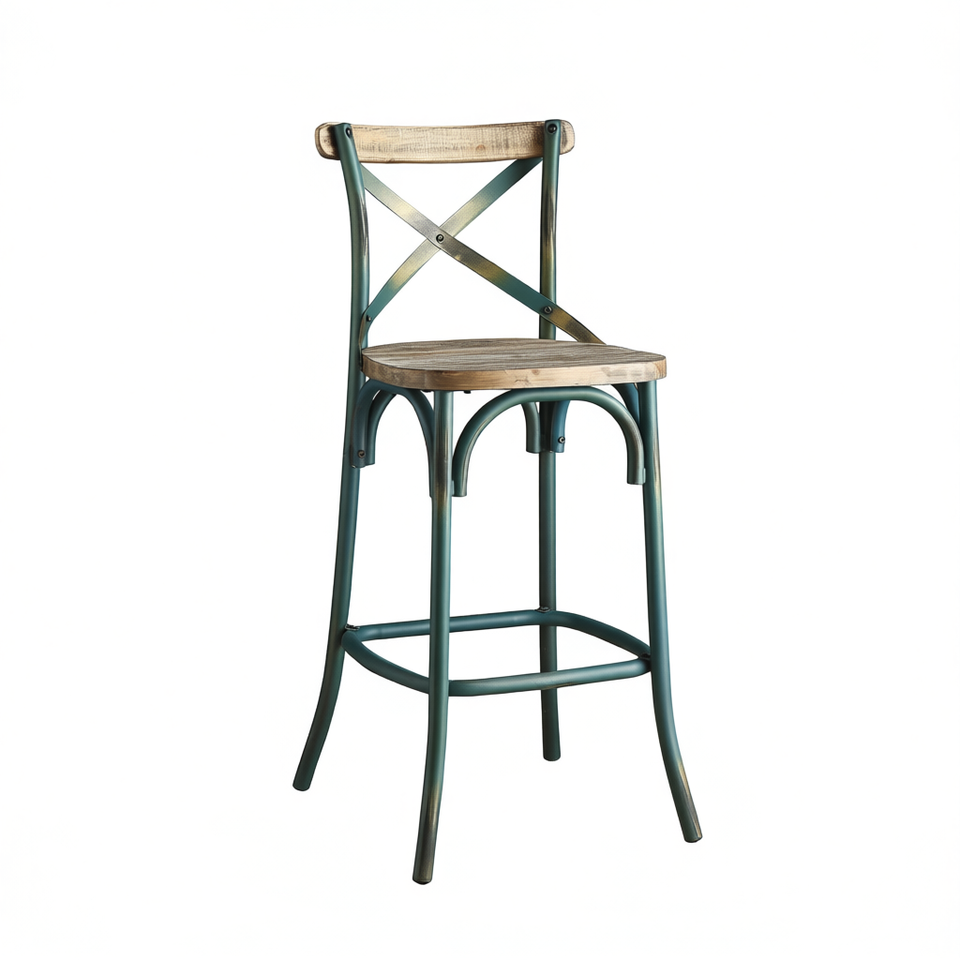 Antique Oak Bar Stool With Cross Back Metal Frame Commercial Furniture