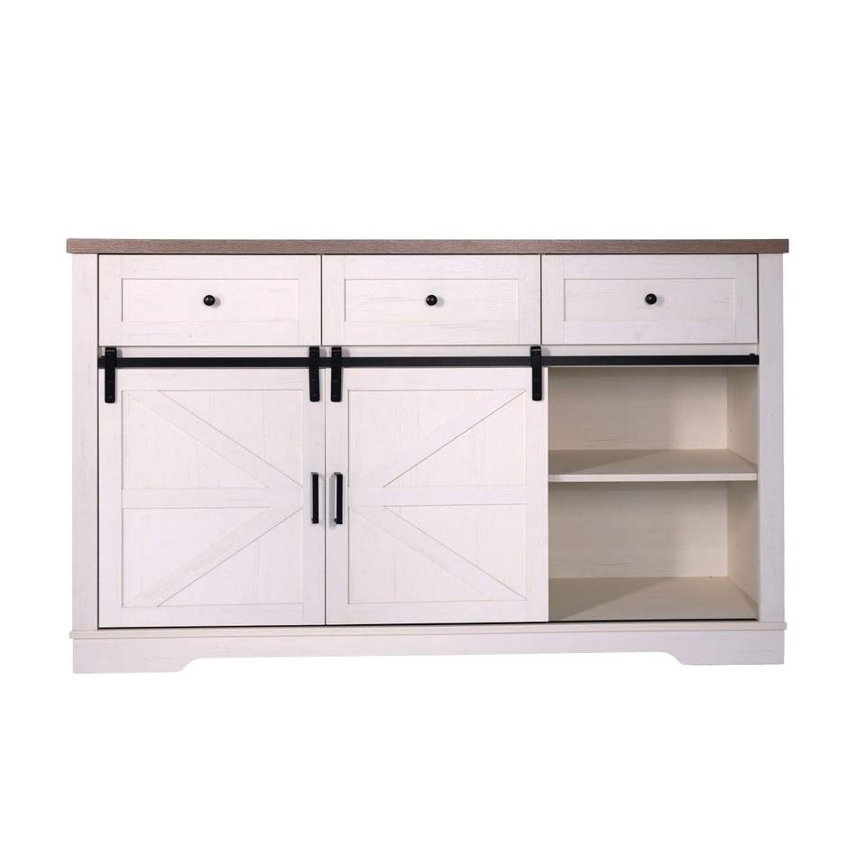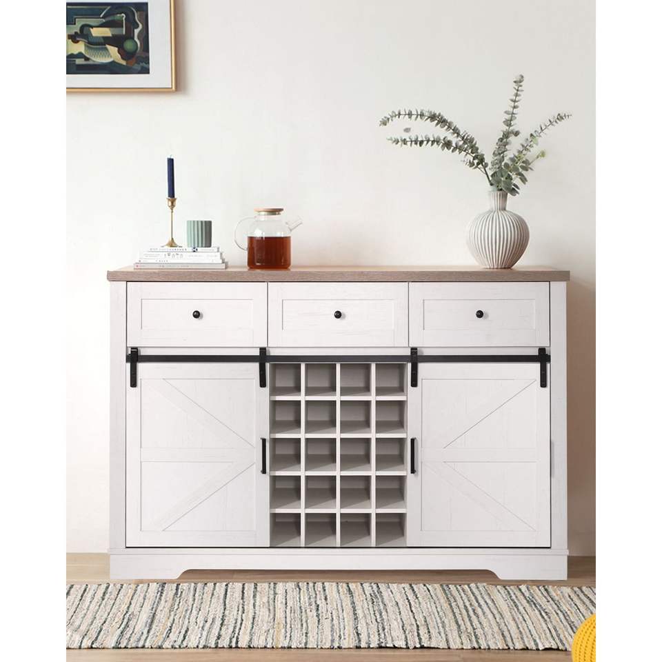 Antique White 54\" Kitchen Coffee Bar Cabinet Rustic Large Buffet Sideboard 3 Drawers Wine Glass Rack Storage Shelves Bar