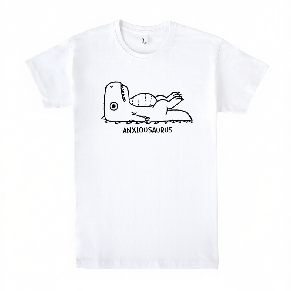 T-Shirt Anxiousaurus Bianca con Collo Rotondo e Stampa Serigrafica, Uso Promozionale, Unisex, Taglie per Adulti S M L XL XXL