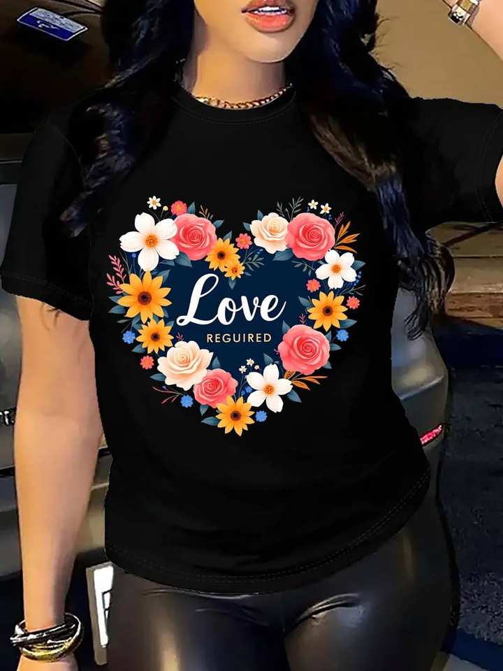 Aqua Women's Heart-Shaped Floral Print T-Shirt Short Sleeve Round Neck Breathable 100% Cotton Casual Spring Summer Top