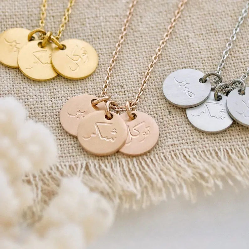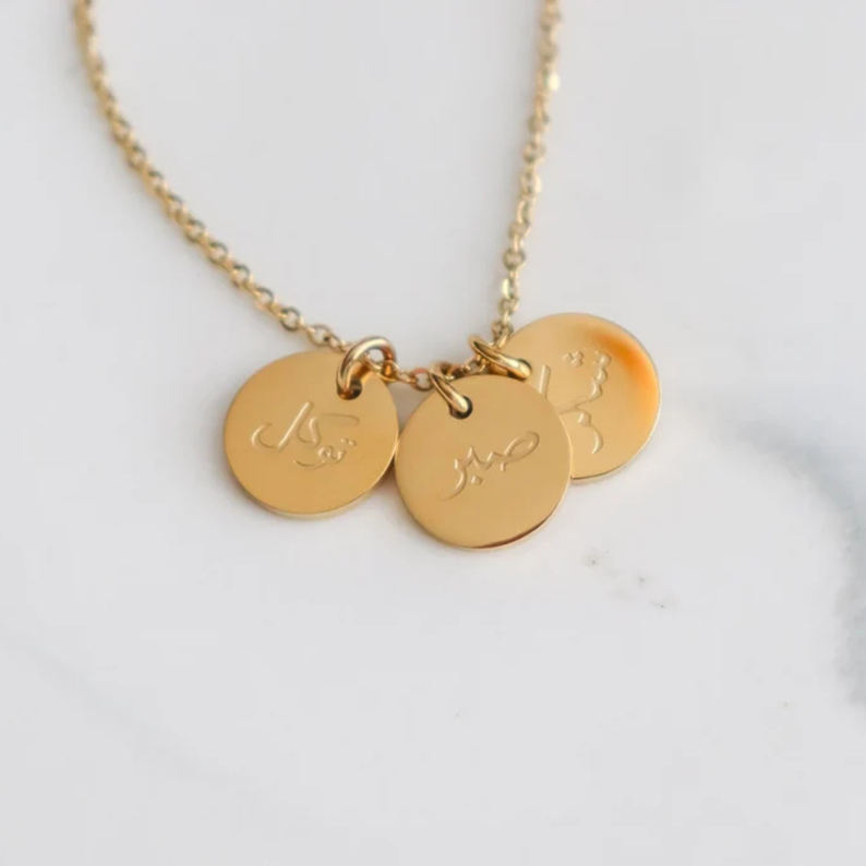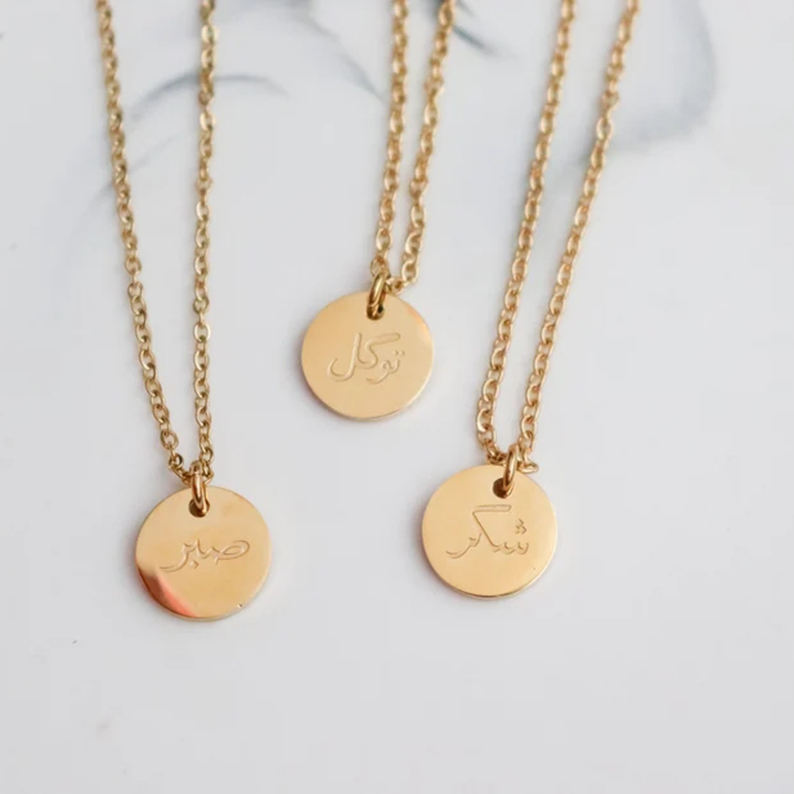 Pendente in moneta di gioielli arabi Personalizzato con parola ispiratrice Patience Grato Mi sono fidato della collana islamica Sabr Shukr Tawakkul