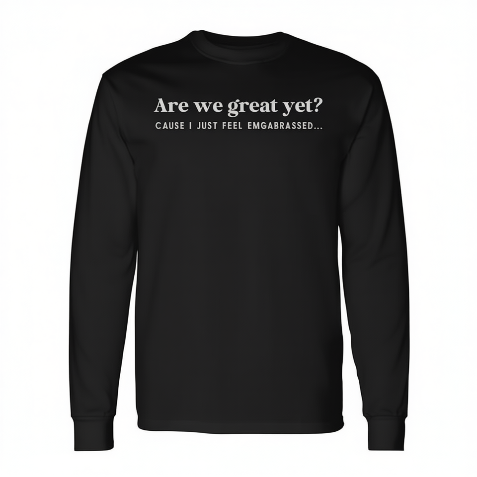Maglietta a maniche lunghe con citazione 'Are We Great Yet' nera unisex taglia adulto