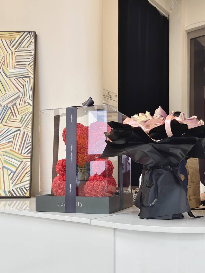 Decorazione con Fiori Artificiali, Orsacchiotto di Rose in Schiuma/PE da 25cm con Scatole Regalo e Luci LED, Regalo per la Festa della Mamma e San Valentino