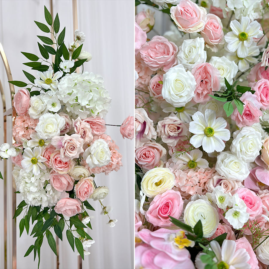 Fiori Artificiali in Seta Inclusi Rose Bianche, Rose Rosa, Ortensie, Margherite e Fogliame Disposti Come Sfondo Decorativo
