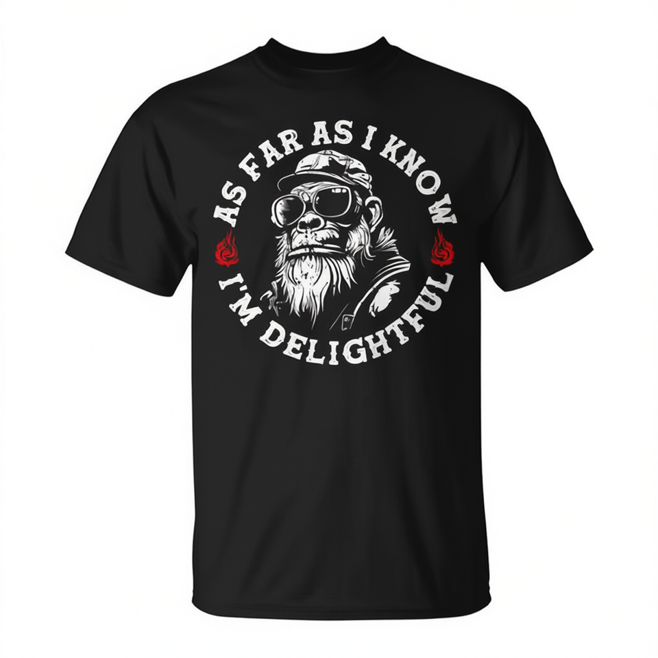 T-shirt promozionale da uomo nera con stampa 'As Far As I Know I'm Delightful Monkey Biker'