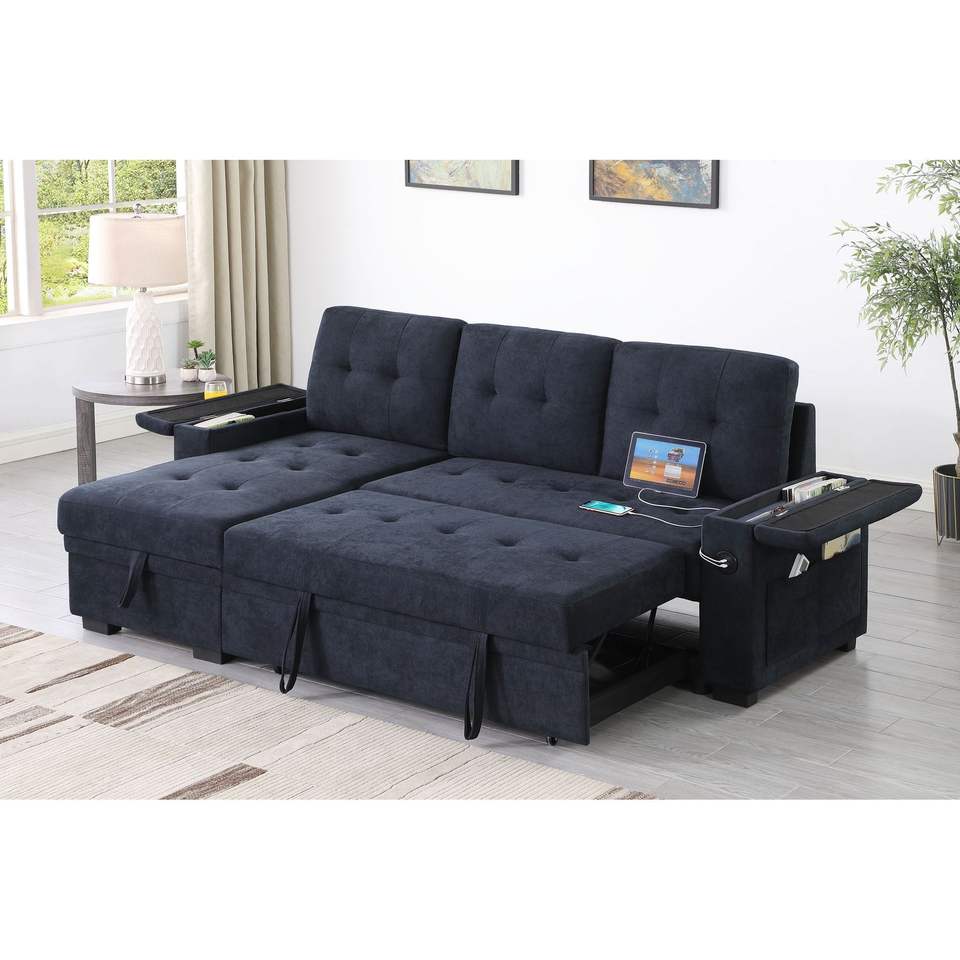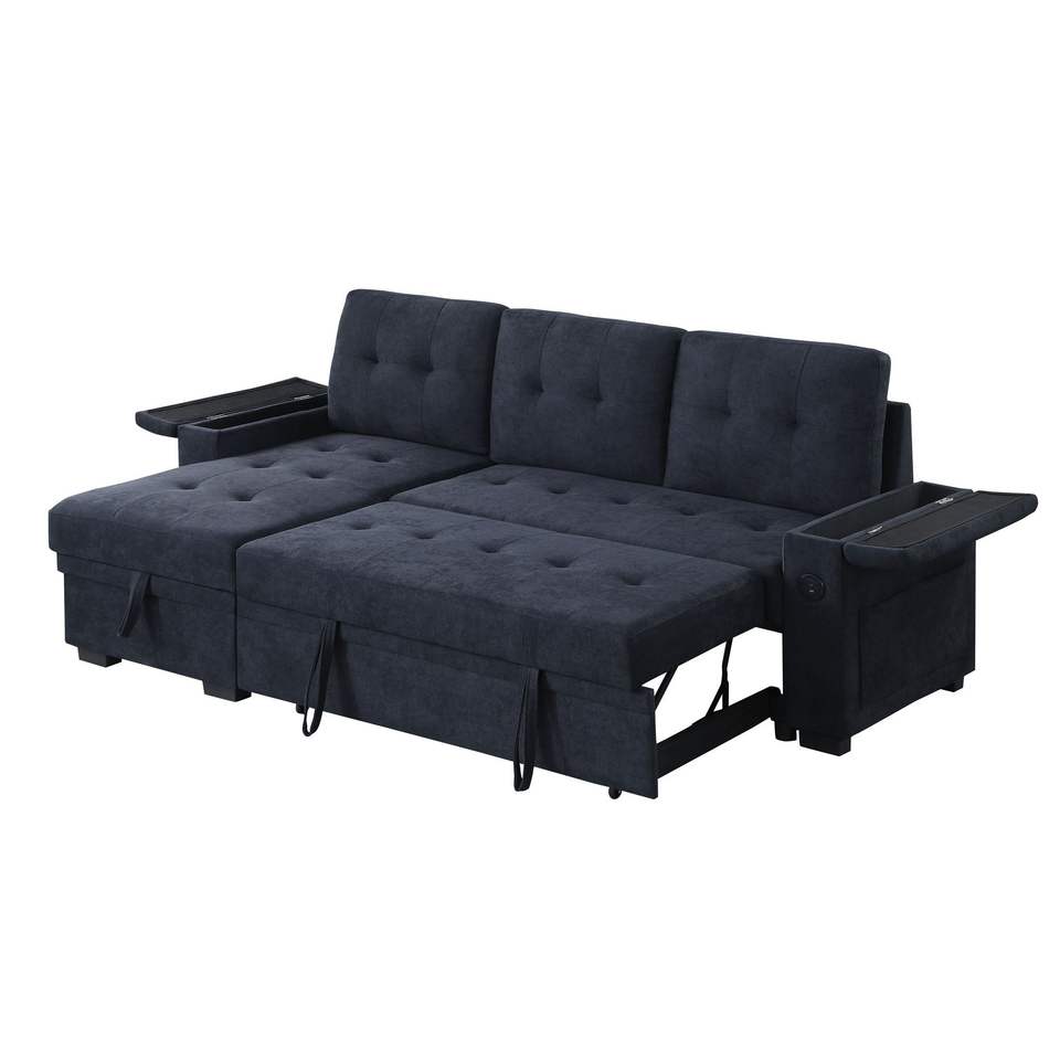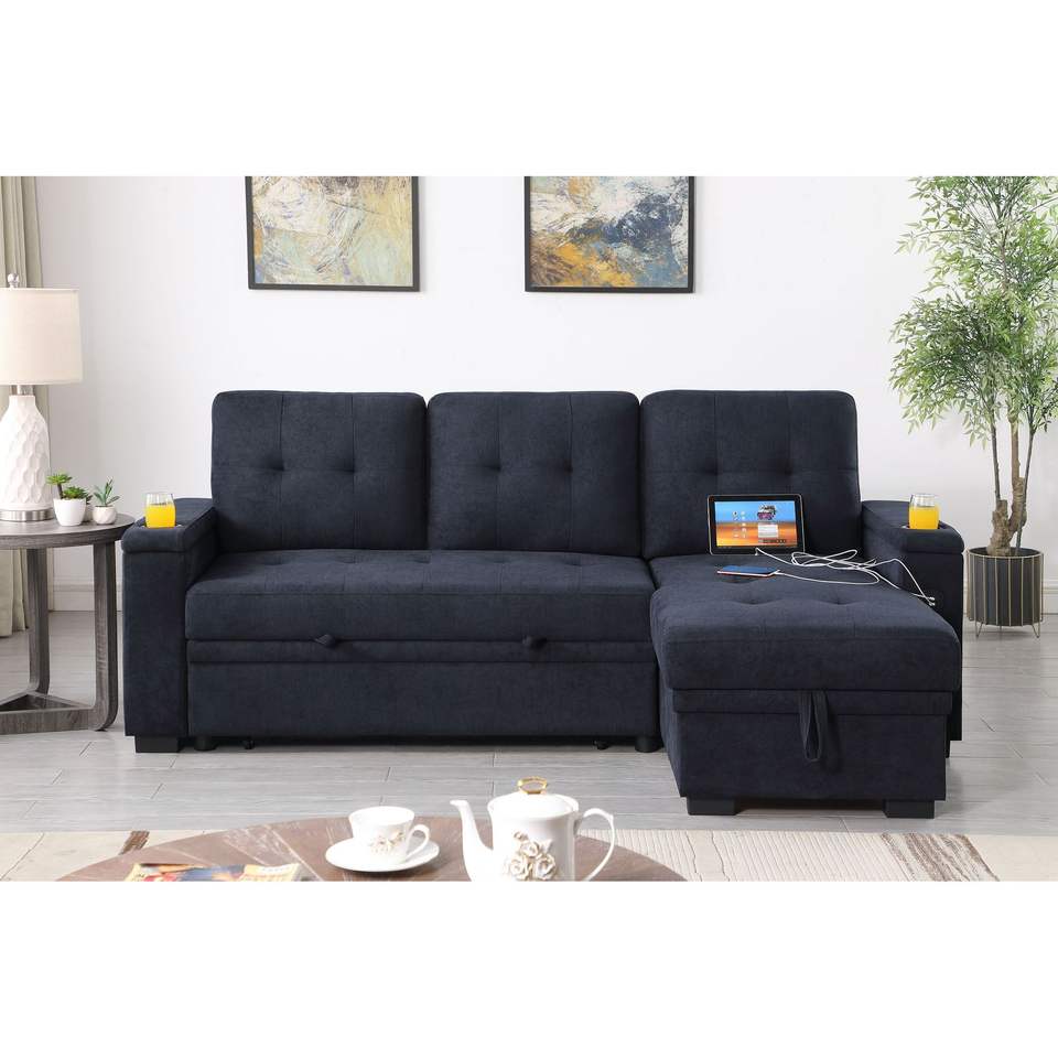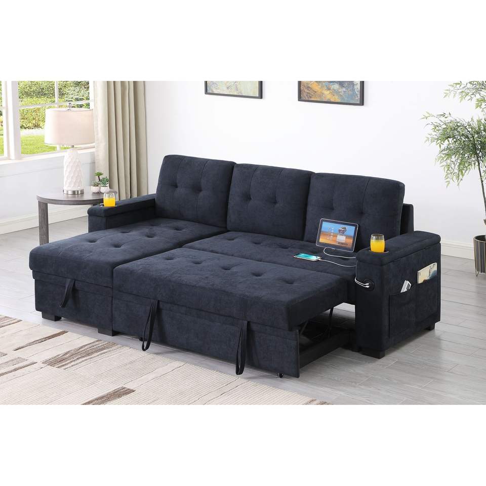Divano Sezionale Reversibile Ashlyn II 84'' L, Grigio Scuro, in Tessuto Intrecciato con Chaise Longue Contenitore, Portabicchieri e Funzione di Ricarica