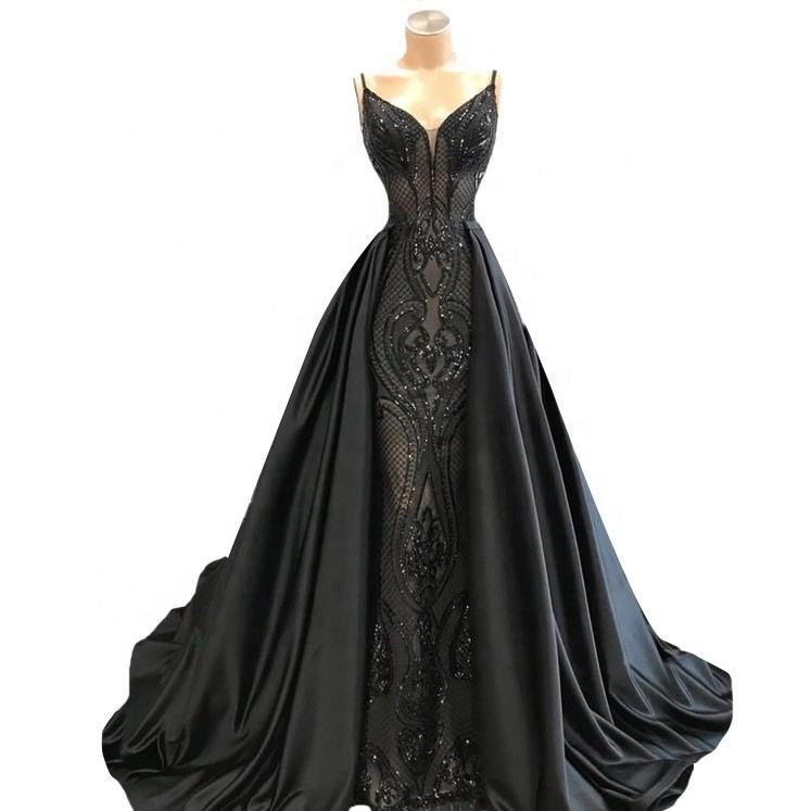 Asian Black Long Banquet Spaghetti Strap Pattern Evening Dress