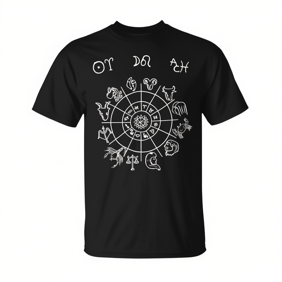 T-shirt astrologica con segni zodiacali, design oroscopo, abbigliamento unisex in cotone nero