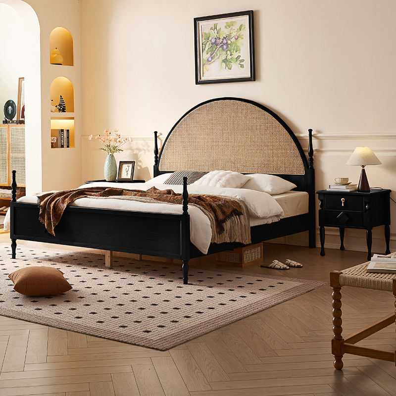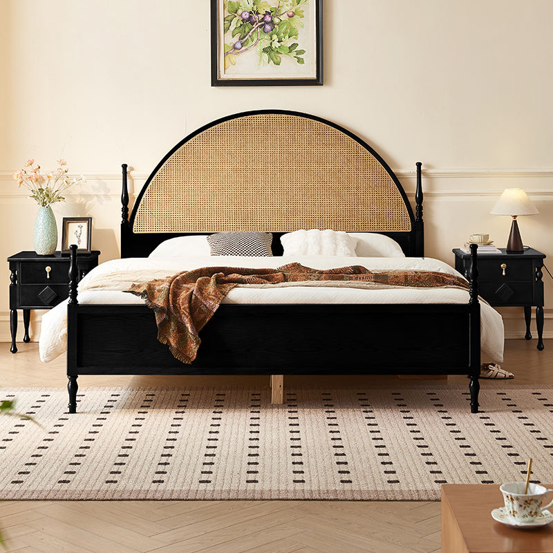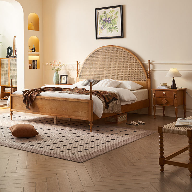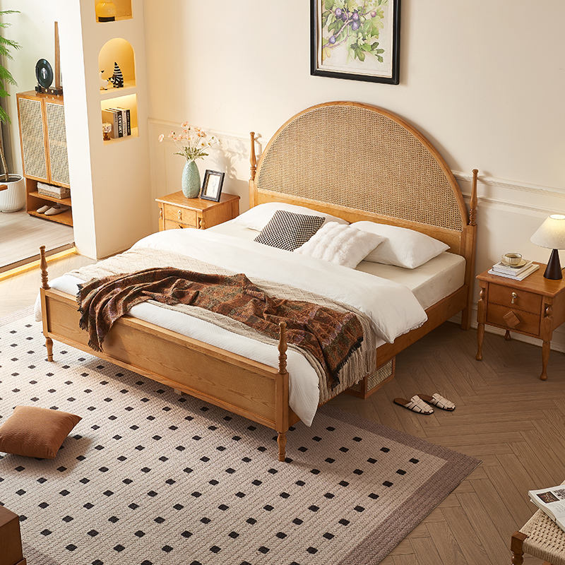 Struttura Letto a Piattaforma in Legno Massello Stile Moderno Boho Australiano con Testiera in Rattan Naturale Curvata per Camera da Letto