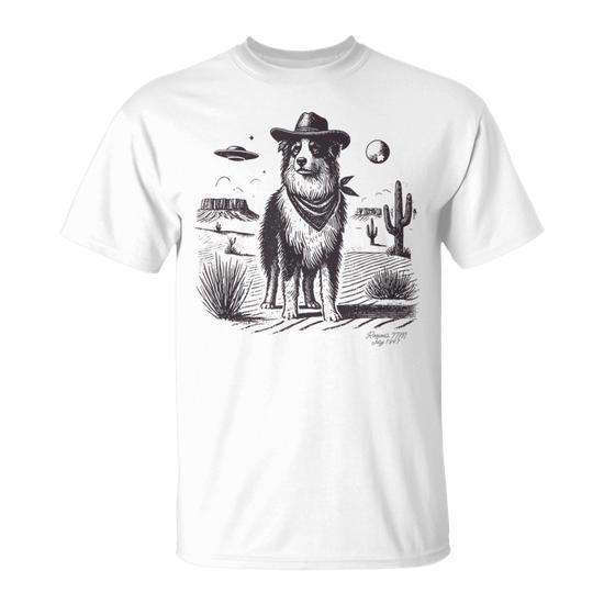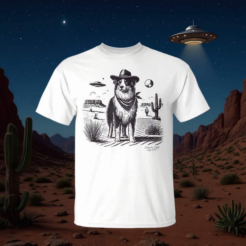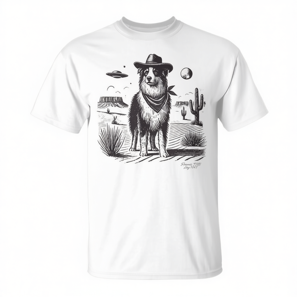 T-shirt Unisex per Adulti con Stampa Serigrafica di Cane Pastore Australiano, UFO e Scena del Deserto, Prodotto in Cina