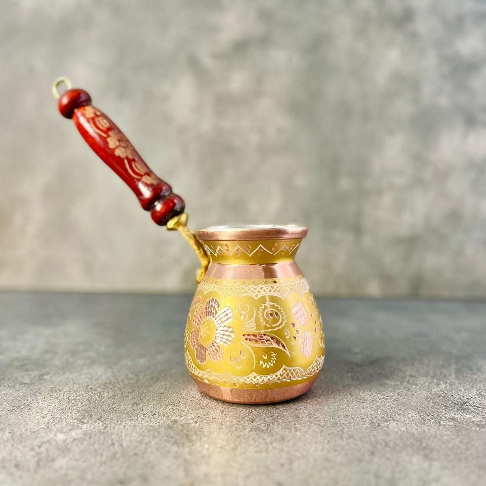 Authentic Style Turkish Coffee Brewing Cezve with Hammered Metal Body and Smooth Wooden Handle for Traditional Coffee Lovers