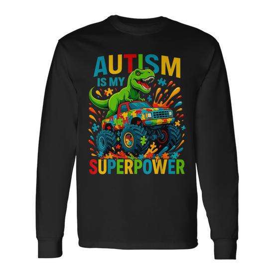 T-shirt a maniche lunghe unisex per adulti con stampa digitale: L'autismo è la mia superpotenza - Dinosauri e Monster Truck - Eventi Walk Run