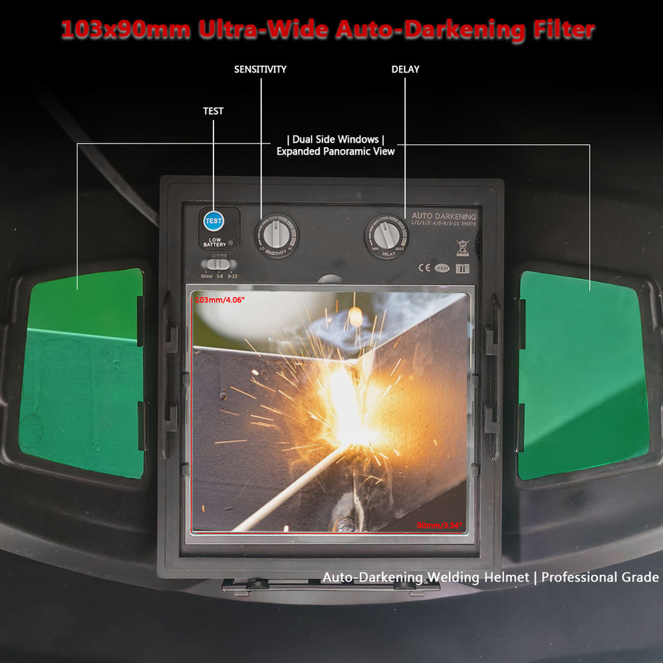 Casco per Saldatura ad Oscuramento Automatico Protezione Viso per Saldatore Ampia Visuale 103x90mm con Finestre Laterali per Sicurezza e Comfort Alimentazione Solare CE