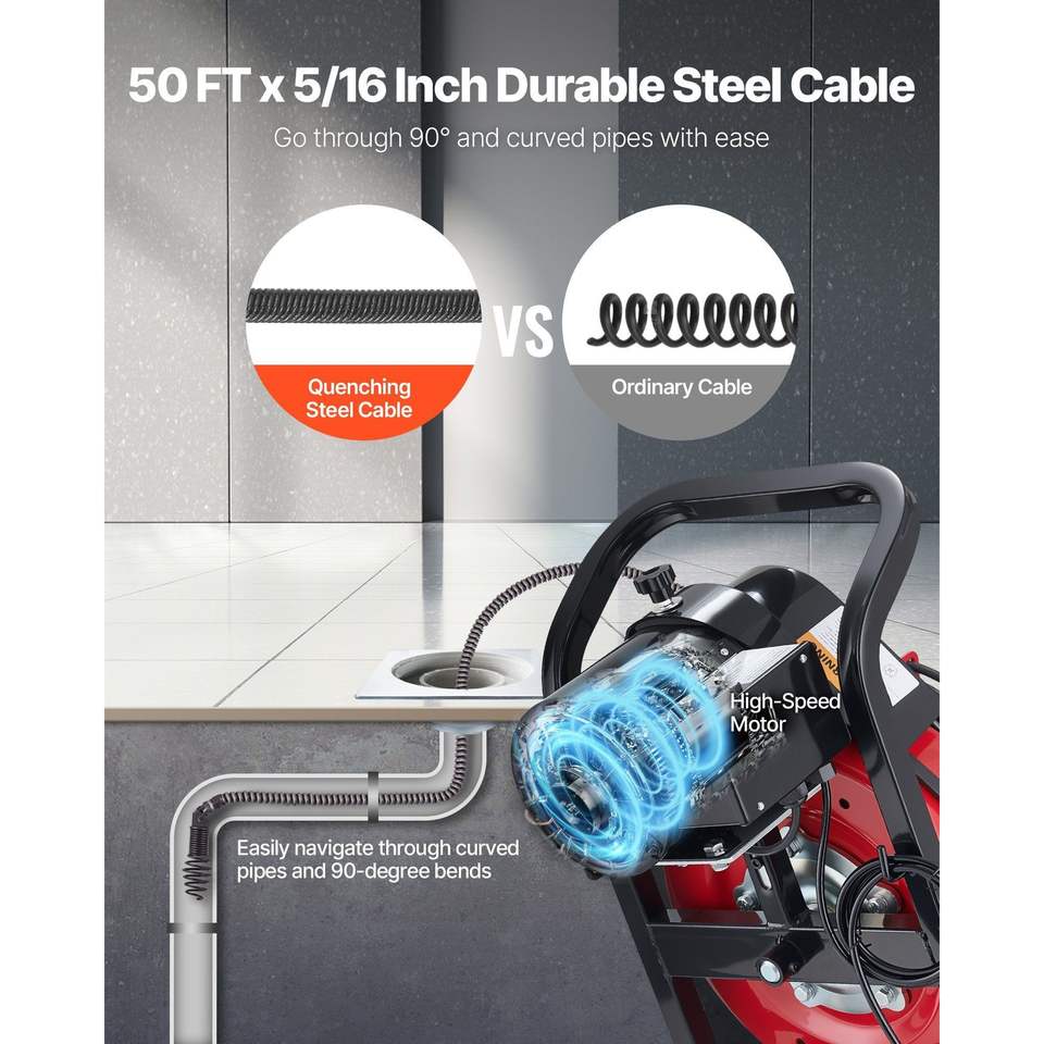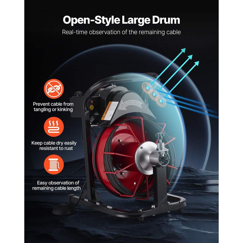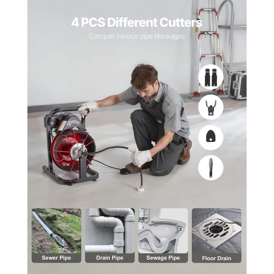 Sonda per la pulizia di scarichi con alimentazione automatica, 50 FT, 5/16 pollici, con 4 frese, attivazione ad aria, interruttore a pedale da 2-4 pollici