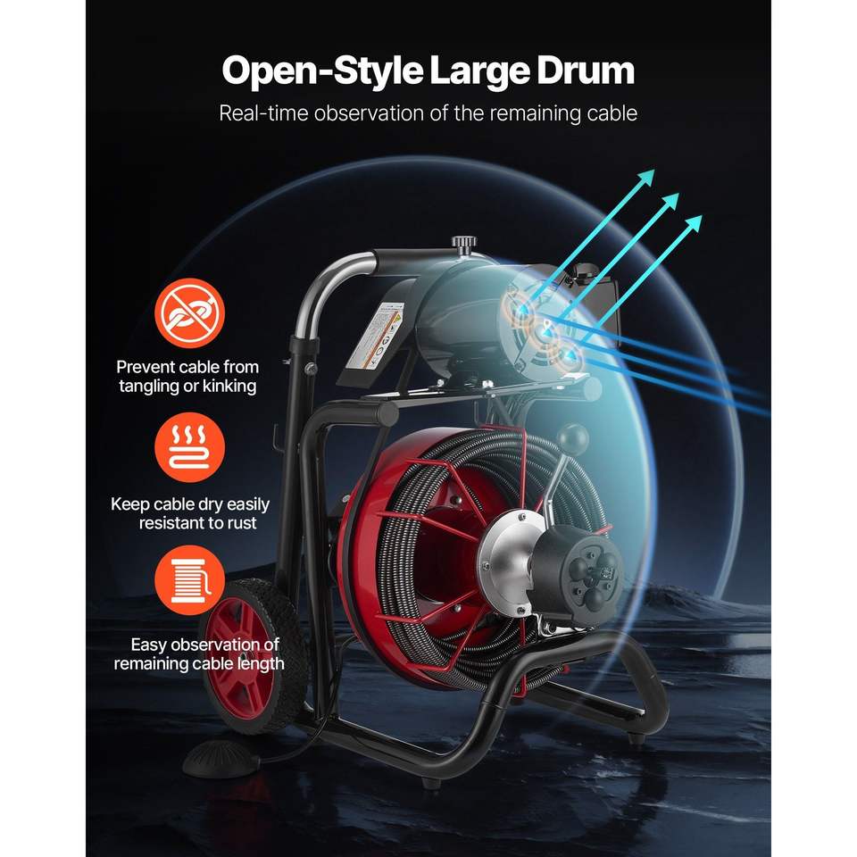 Sonda per la pulizia delle fognature con alimentazione automatica su ruote, 8 frese, 30,5 m x 3/8 pollici, macchina per la pulizia degli scarichi con interruttore a pedale ad azionamento pneumatico