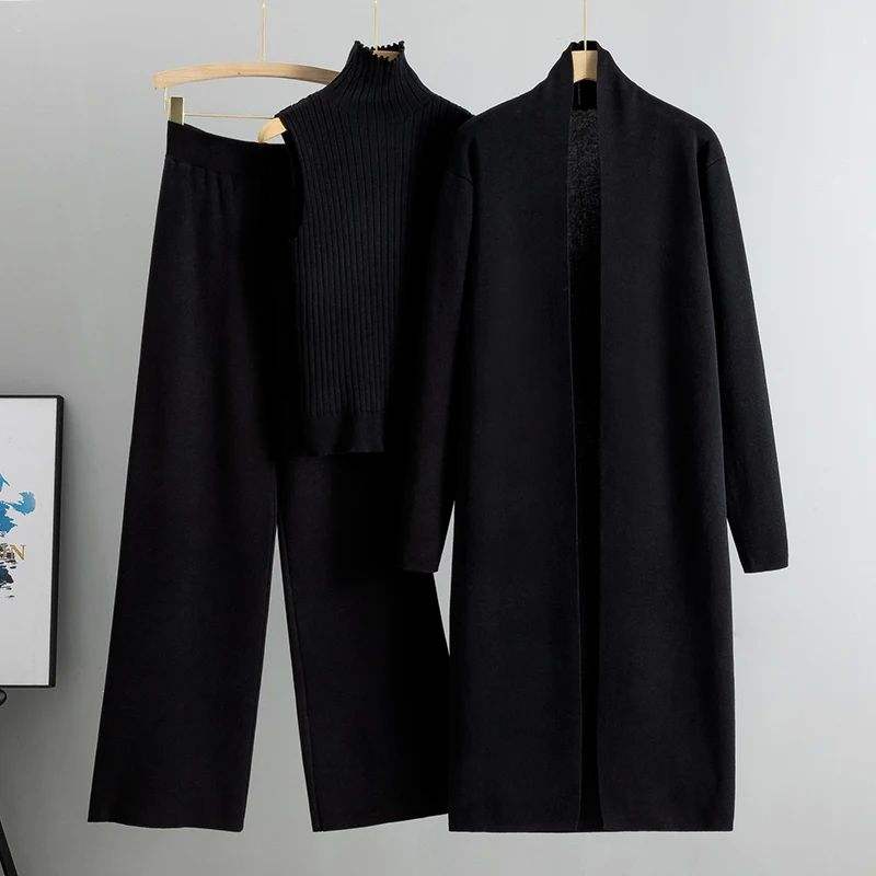 Set Autunnale Elegante e Semplice in Maglia di Cashmere, Canotta Senza Maniche + Cardigan Lungo + Pantaloni, Completo Tre Pezzi in Cashmere