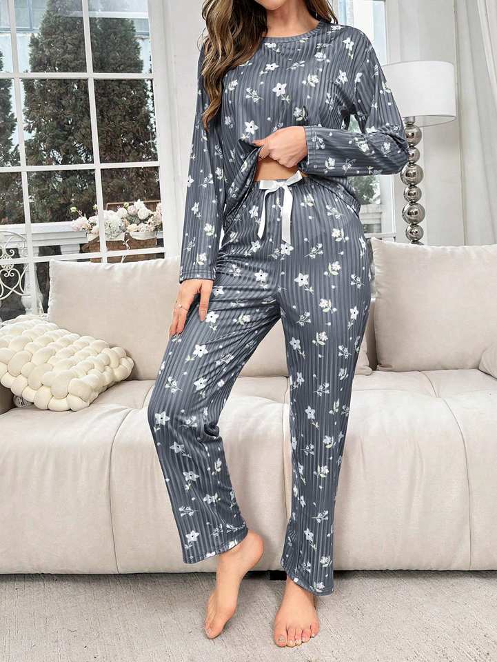 Set Pigiama Autunnale da Donna con Stampa Floreale, Maniche Lunghe e Pantaloni, 2 Pezzi, Abbigliamento per il Tempo Libero