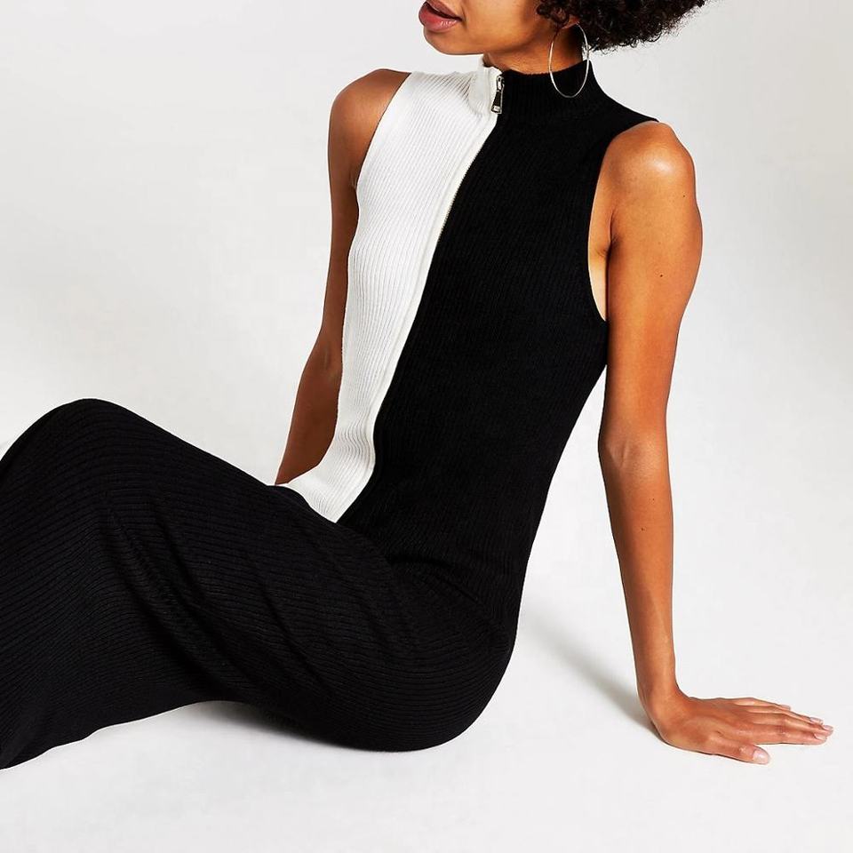 Autumn New Arrivals Zip Front Fastening Women Dress Sleeveless Elegant White Black Blocked Color Long Knit Dress