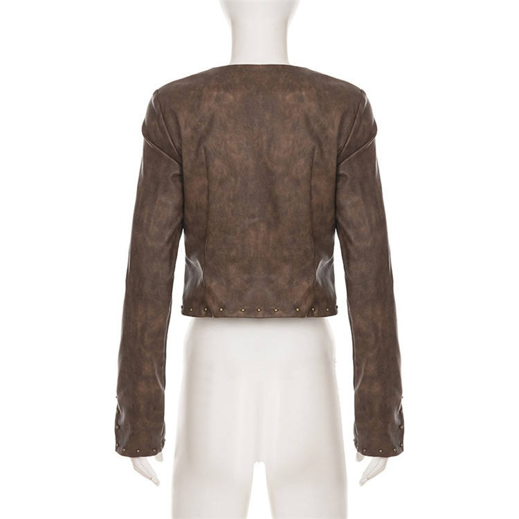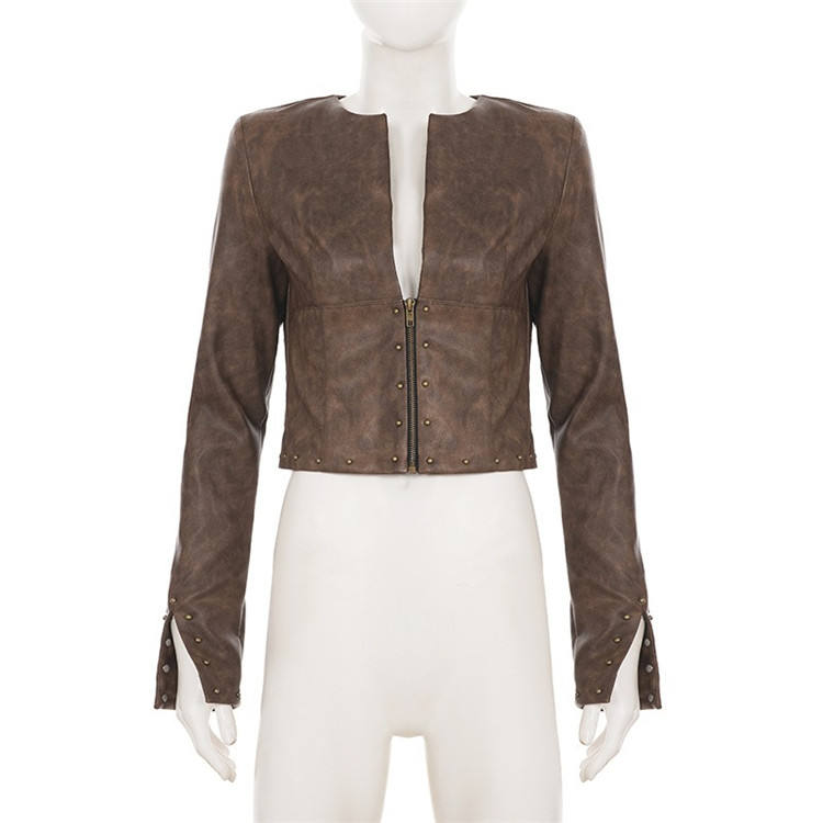 Autumn New Fashion Bead Leather Patchwork Coat Women Zipper Deep V-Neck Long Sleeve Crop Jacket