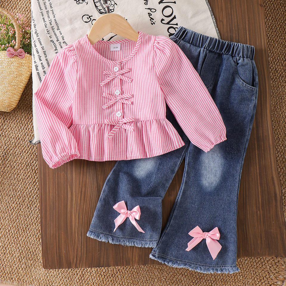Nuovo Stile Autunnale Top a Righe Rosa con Jeans Abbigliamento per Ragazze Stile Dolce Vendita all'Ingrosso