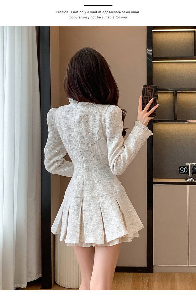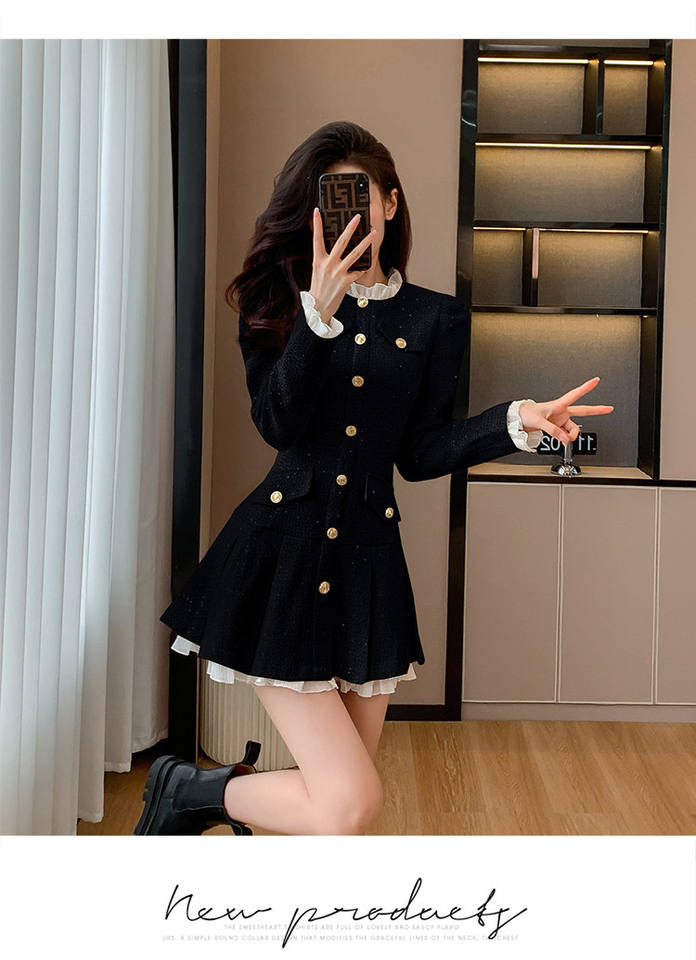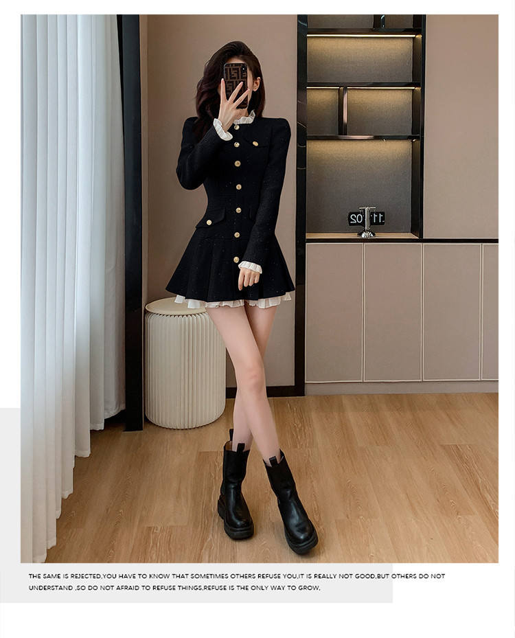Abito Mini a Linea A con Colletto a Volant, Maniche Lunghe e Vita Stretta per Donna, Vestito Nero di Lusso Francese per Autunno e Inverno
