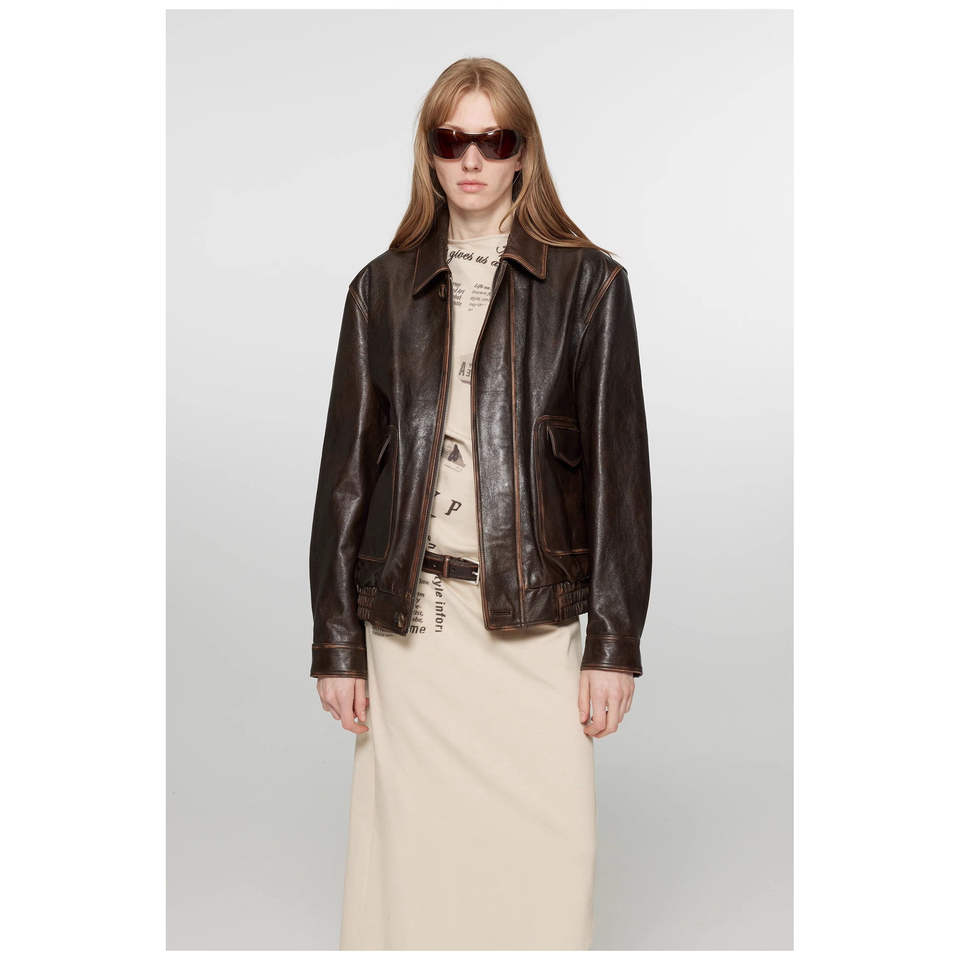 Giacca Bomber Autunnale Vintage in Pelle di Mucca Marrone con Maniche Lunghe, Tessuto Intrecciato e Colletto Rovesciato dalla Nuova Zelanda
