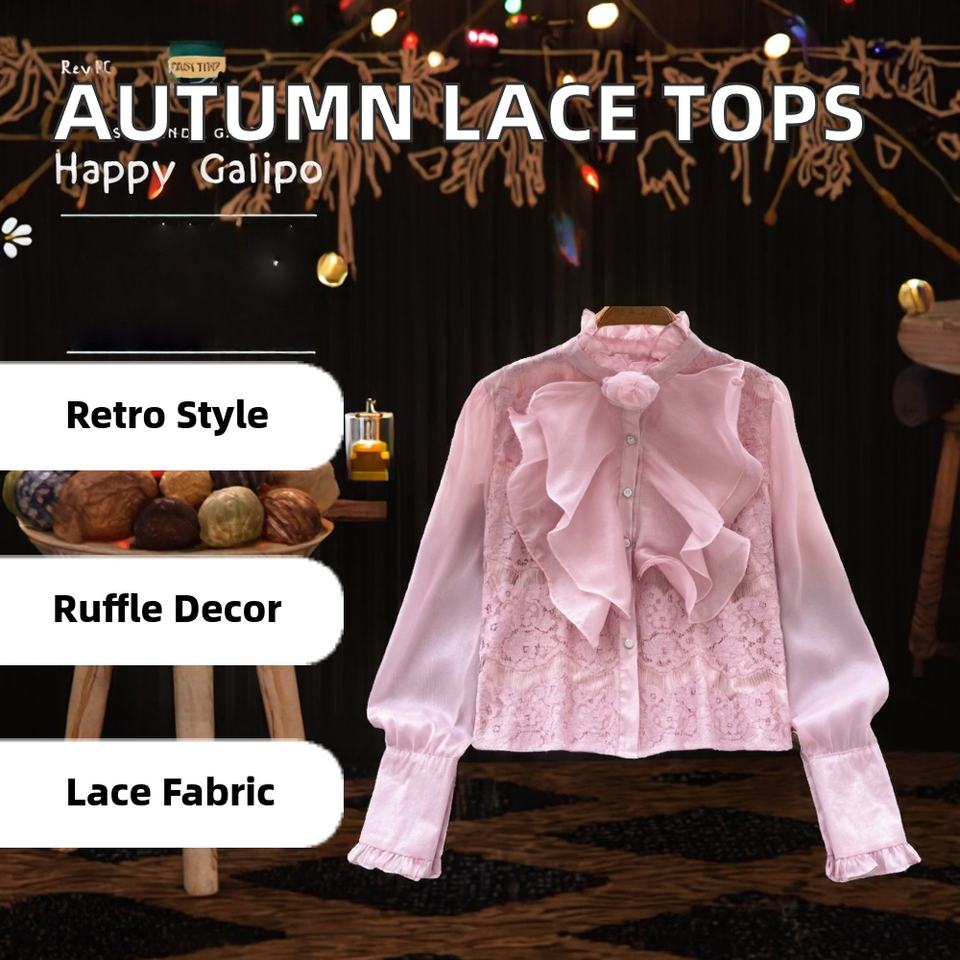 Camicette Vintage Autunnali a Maniche Lunghe con Colletto Casual Stampate in Pizzo per Donne Camicie Floreali con Volant Eleganti Top Abbigliamento all'Ingrosso