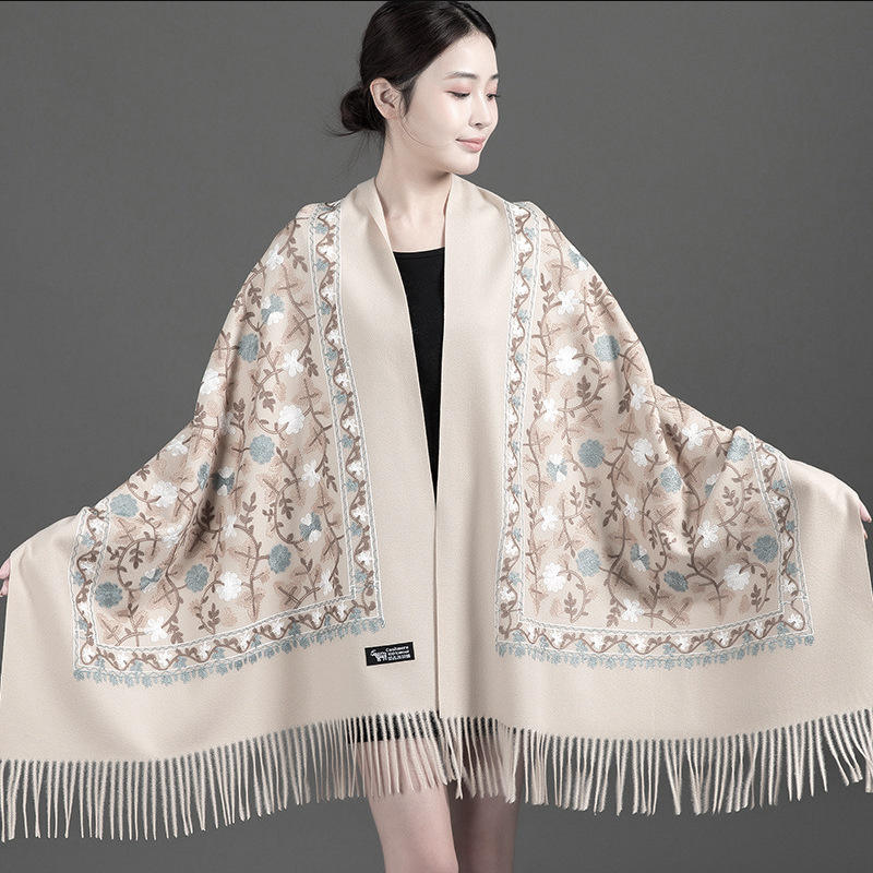 Sciarpa Pashmina Ricamata Floreale Autunno/Inverno Mantella da Viaggio da Donna Stile Folk con Fiori Paisley e Nappe Scialle di Cachemire