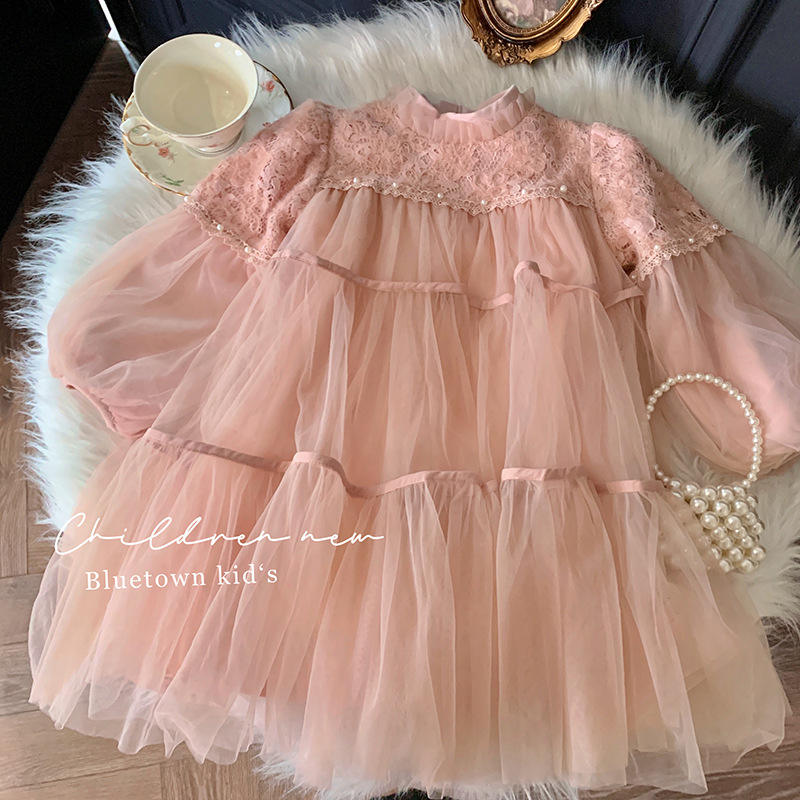 Autumn Winter Girls' Long Sleeve Puffy Dress Fleece-Lined O-Neck Princess Dress Sweet Plain Dyed Children Children Clothing Girl