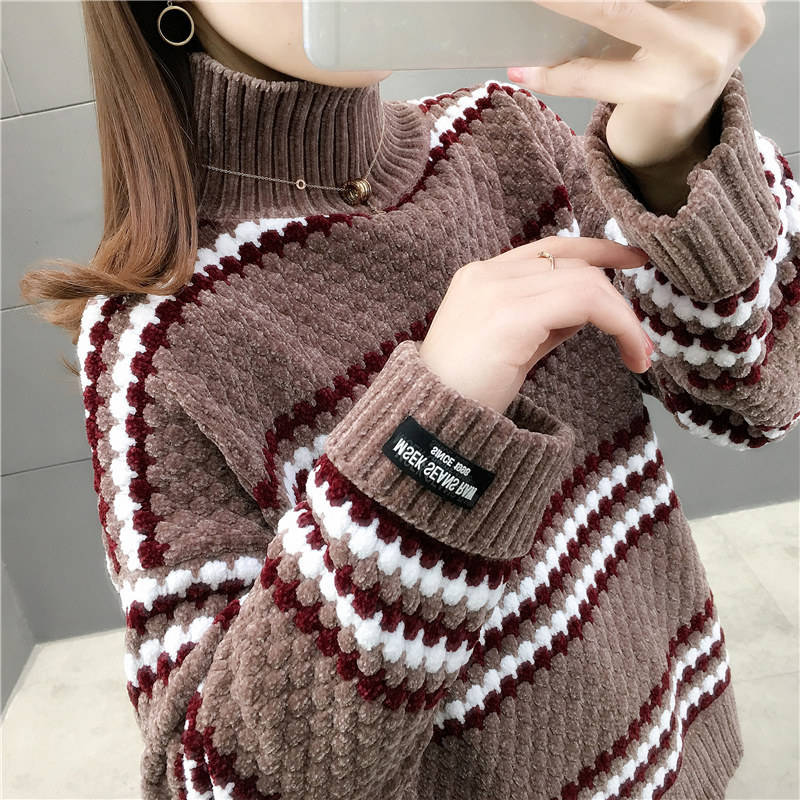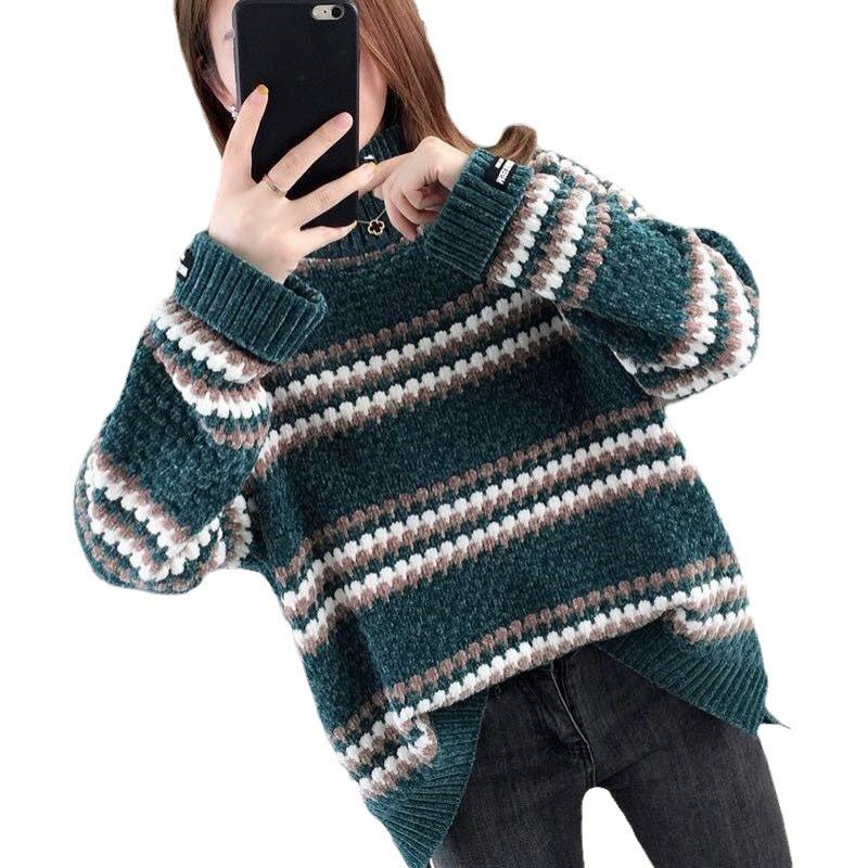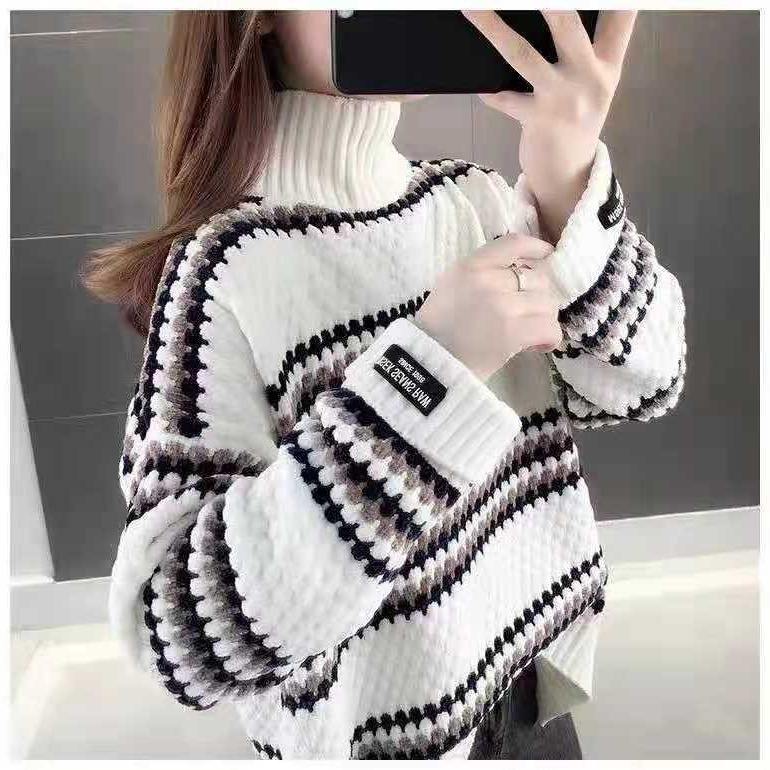 Maglione a Righe da Donna con Mezzo Collo Alto Autunno Inverno, Pullover Caldo e Largo, Maglia Lunga Casual