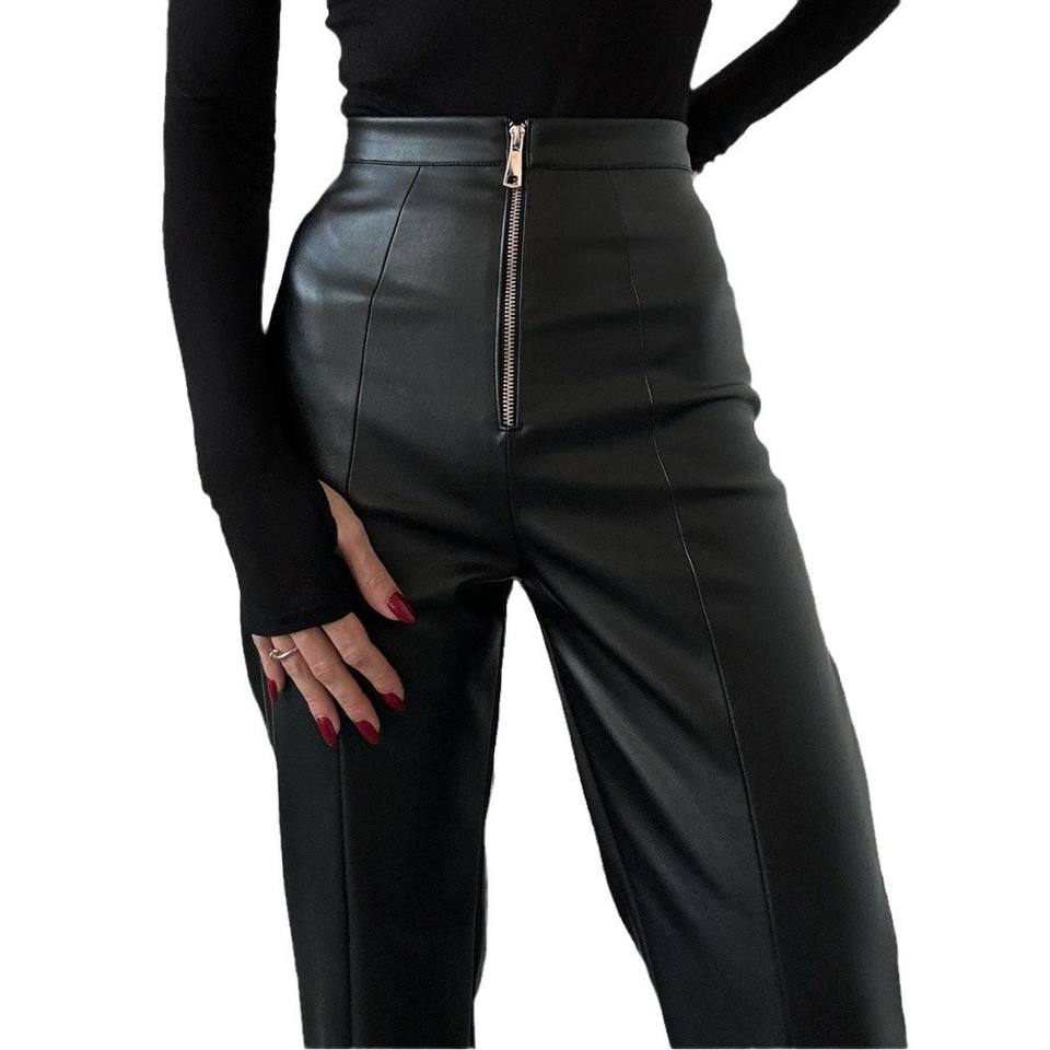 Pantaloni a gamba larga in pelle PU a vita alta tinta unita con spacco sull'orlo Autunno/Inverno Sehe Fashion