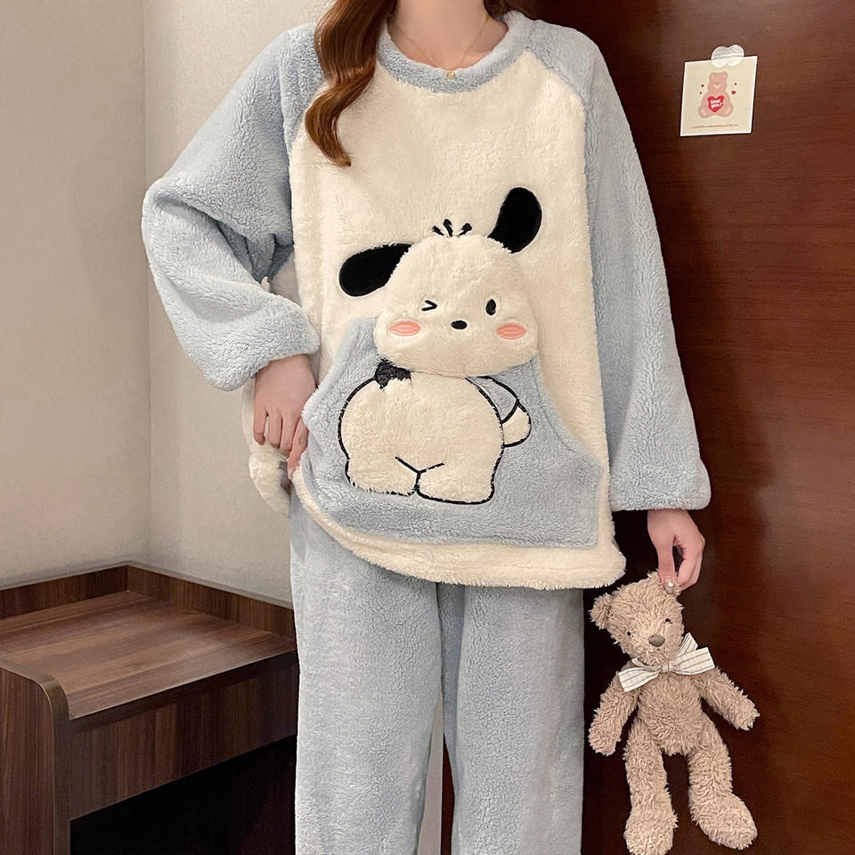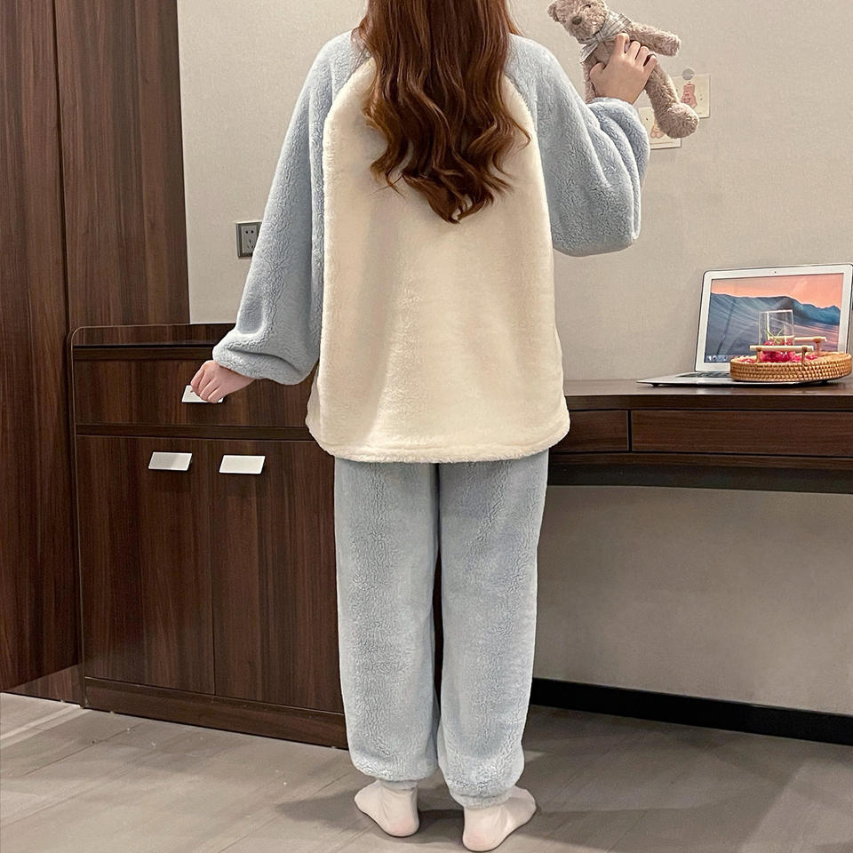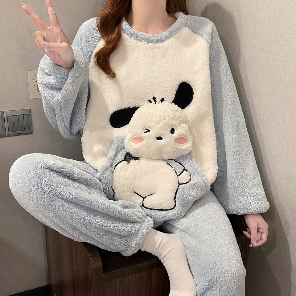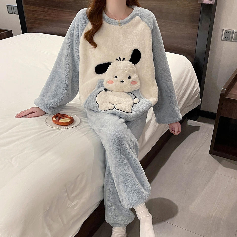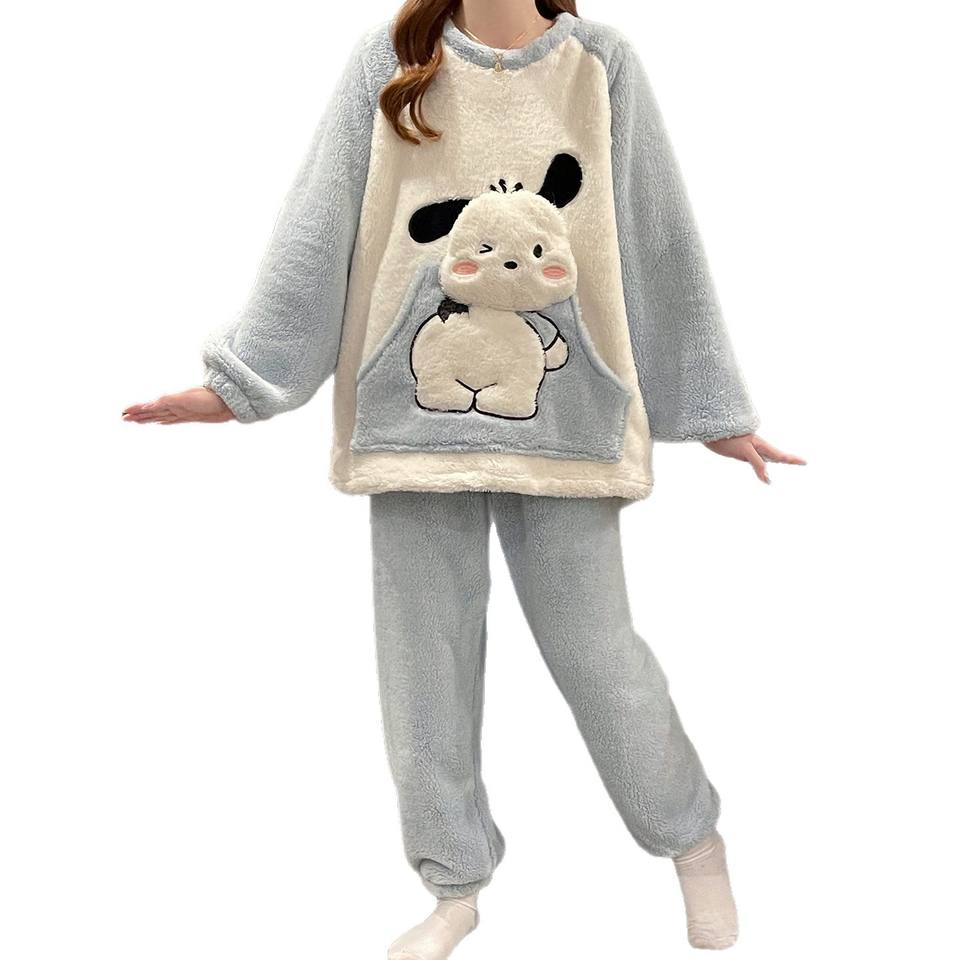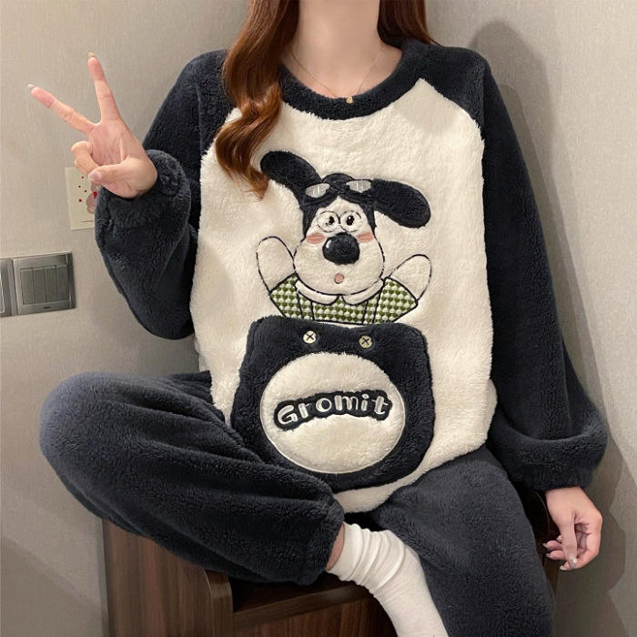 Pigiama Invernale Termico in Pile di Poliestere da Donna Taglie Forti con Stampa Cartoon Carina a Girocollo e Maniche Lunghe