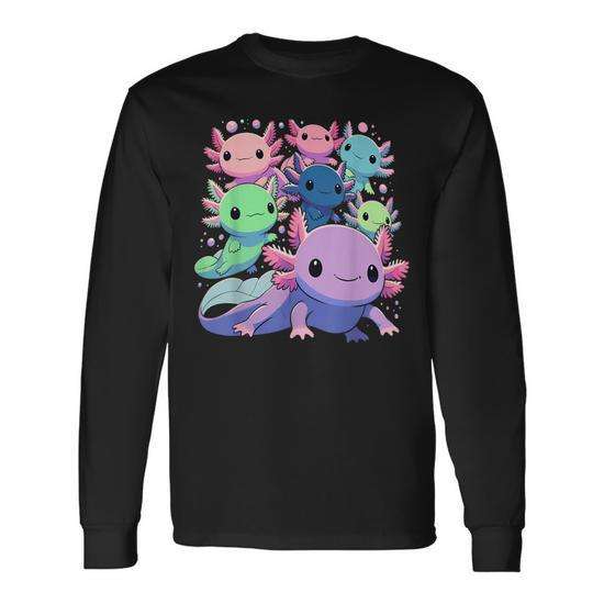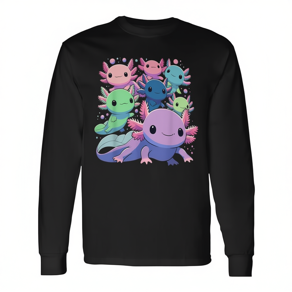 T-shirt a maniche lunghe unisex con stampa digitale di axolotli kawaii, girocollo, per attività promozionali per adulti