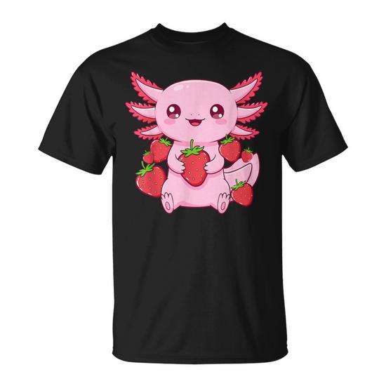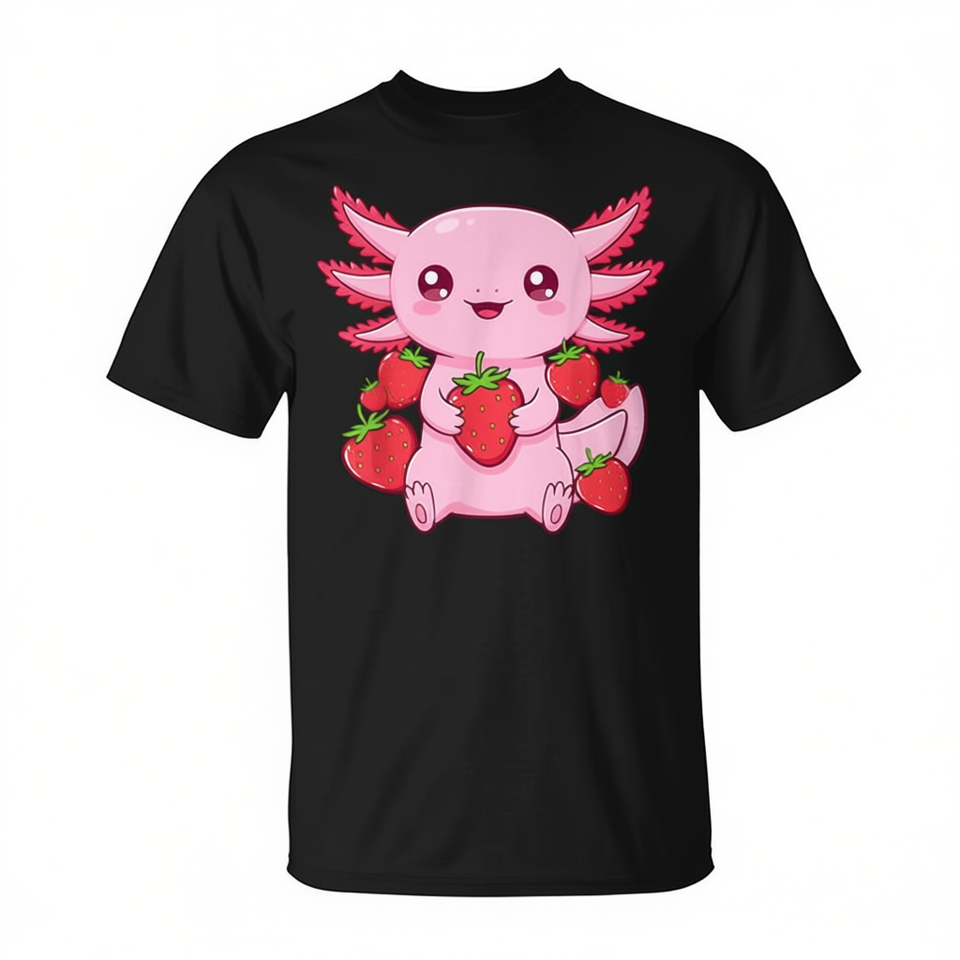 T-shirt Axolotl Strawberries Rosa con design simpatico animale, unisex, girocollo, manica corta, stampa digitale