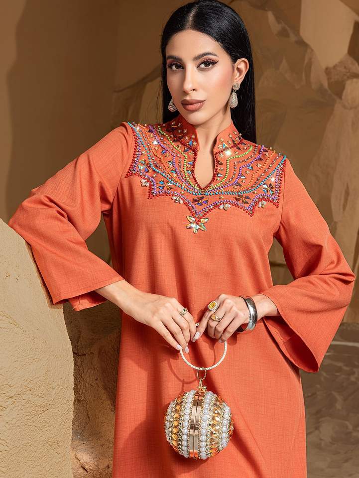 BA5253 Middle Eastern Women's Elegant Arabic Robe High-End Heavy Craft Hand-Sewn Diamond Traditional Muslim Clothing Accessories
